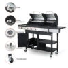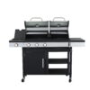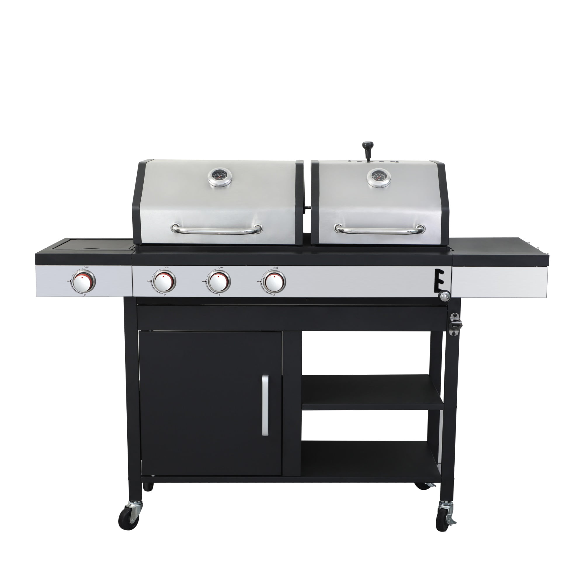 Experience versatile outdoor cooking with the Miniyam Dual Fuel Gas & Charcoal Combo Grill. Equipped with 3 high-performance gas burners, a side burner, and a charcoal section, it delivers powerful heat and rich BBQ flavor. Durable cast iron grates, built-in thermometer, warming racks, and push-and-turn ignition offer control and convenience. Ideal for backyard, patio, or garden grilling, this unit features a storage cabinet, utensil hooks, bottle opener, and lockable wheels for easy movement. Perfect for outdoor parties and family meals.