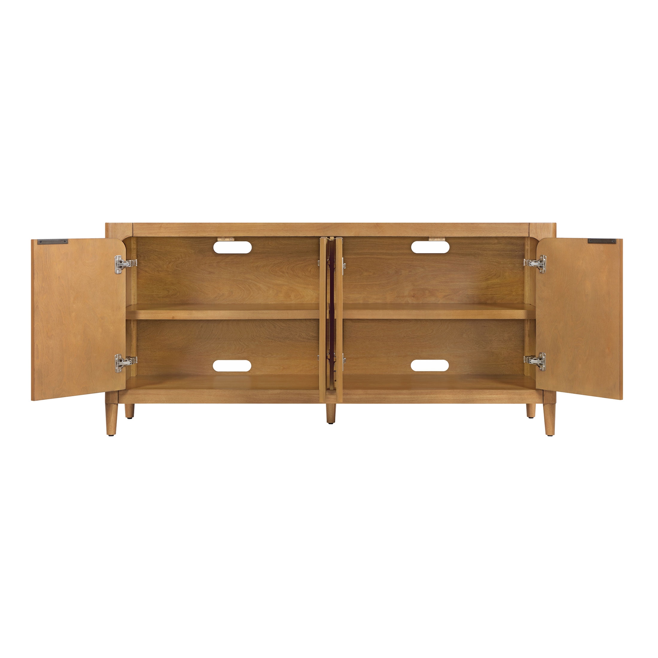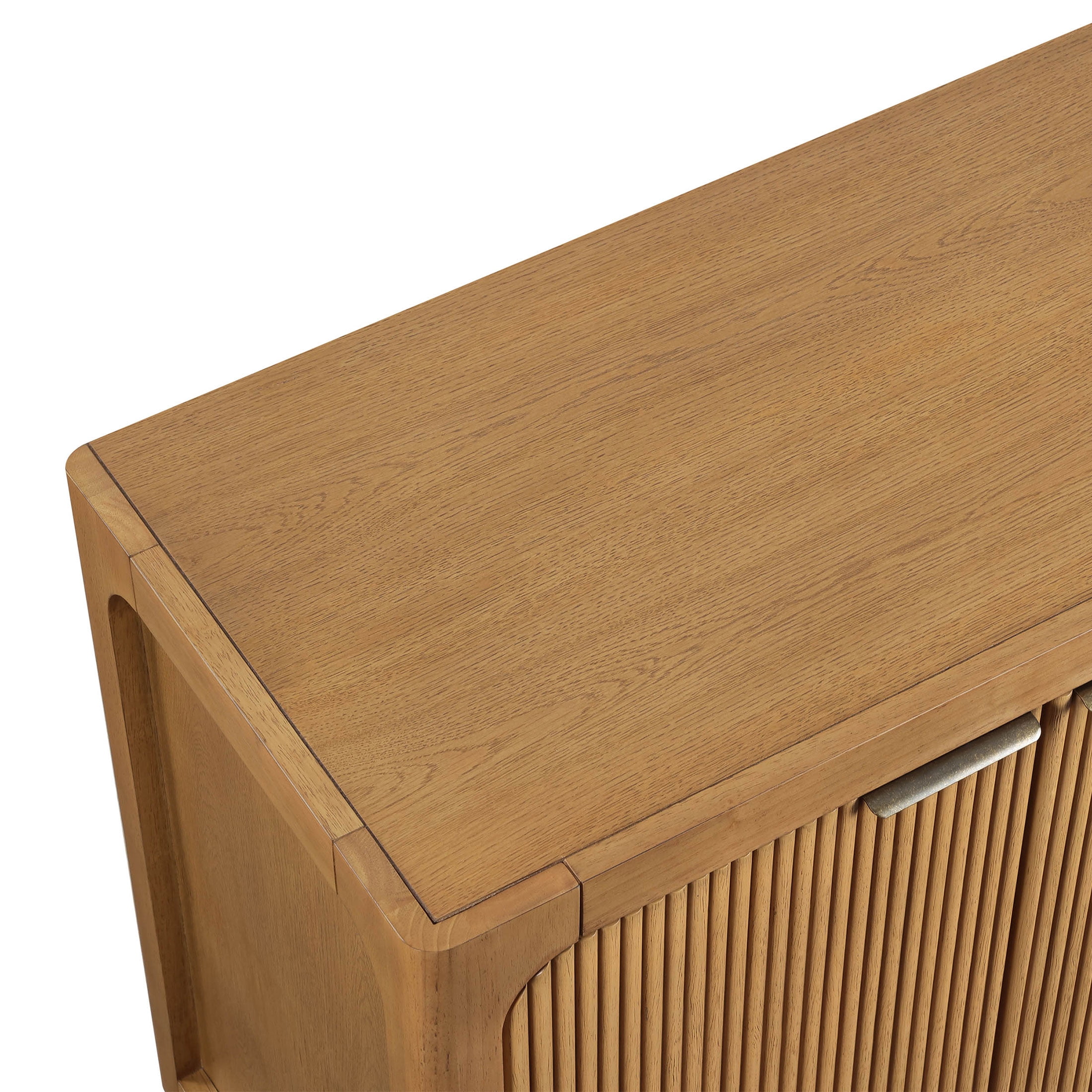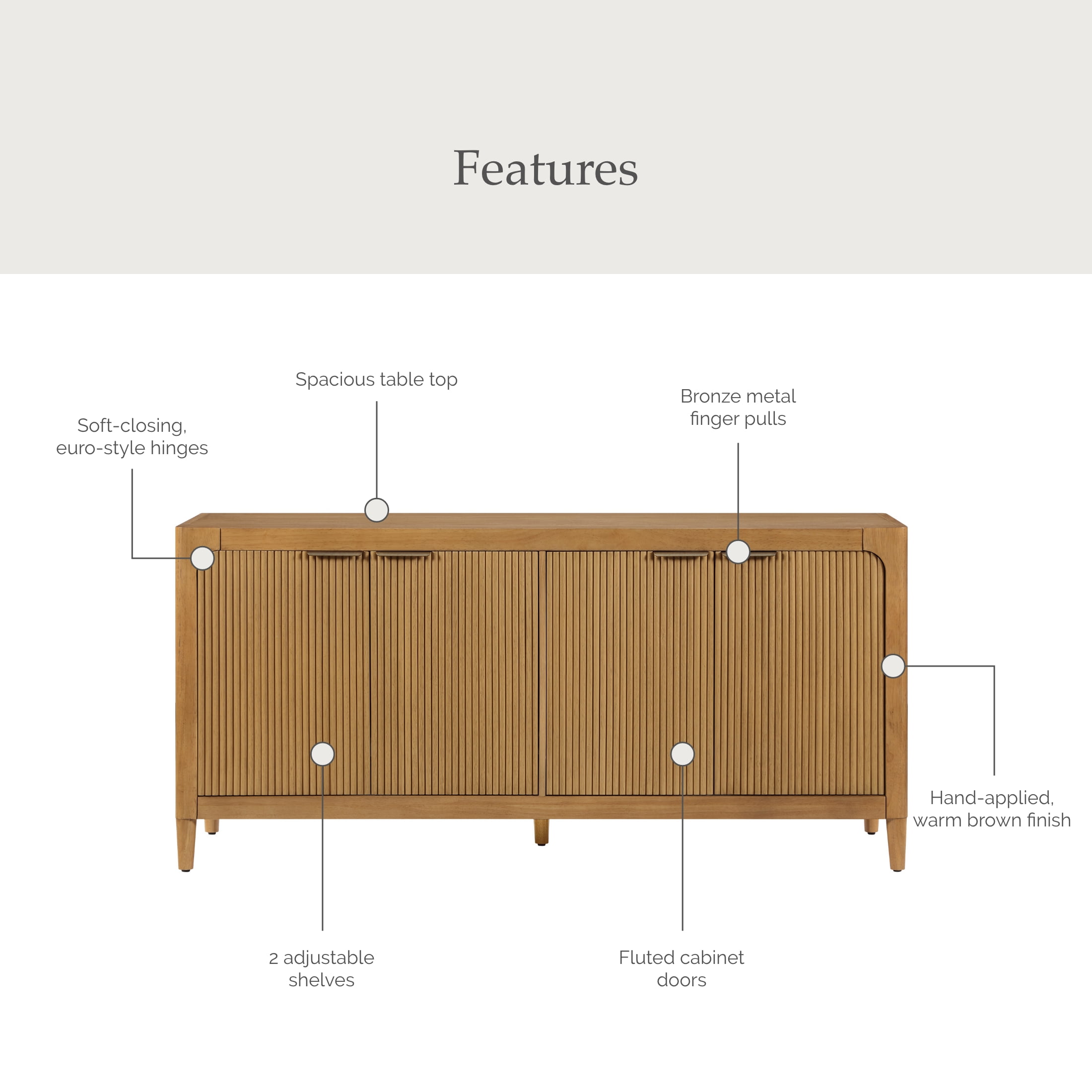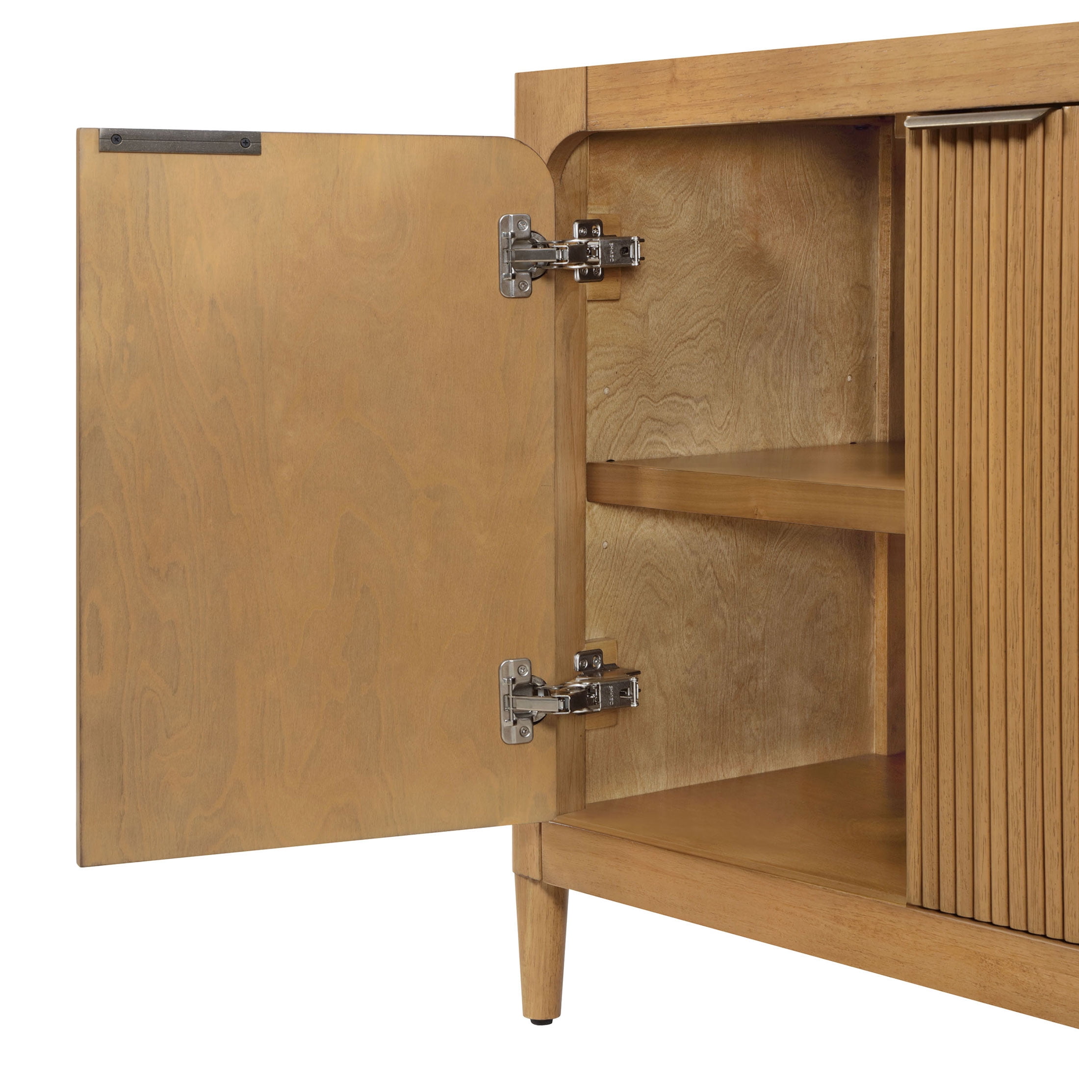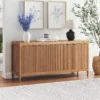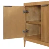 Introducing the My Texas House Linden Fluted Buffet Cabinet, a stylish yet functional addition to your dining area or accent space. Crafted from solid wood and finished in a warm brown tone, this cabinet brings both durability and warmth to your home. The standout fluted cabinet door fronts offer a unique texture that’s as beautiful as it is timeless. Inside, you’ll find two adjustable shelves that give you the flexibility to organize your space just the way you like it. The soft-closing, euro-style hinges ensure a smooth, quiet close every time, while the antique gold metal finger pulls add a touch of elegance. Whether you’re storing dishware, linens, or everyday essentials, this buffet cabinet blends style and practicality seamlessly into your home. Perfect for those who love to entertain or simply want an eye-catching storage solution, this piece brings contemporary charm into any room.