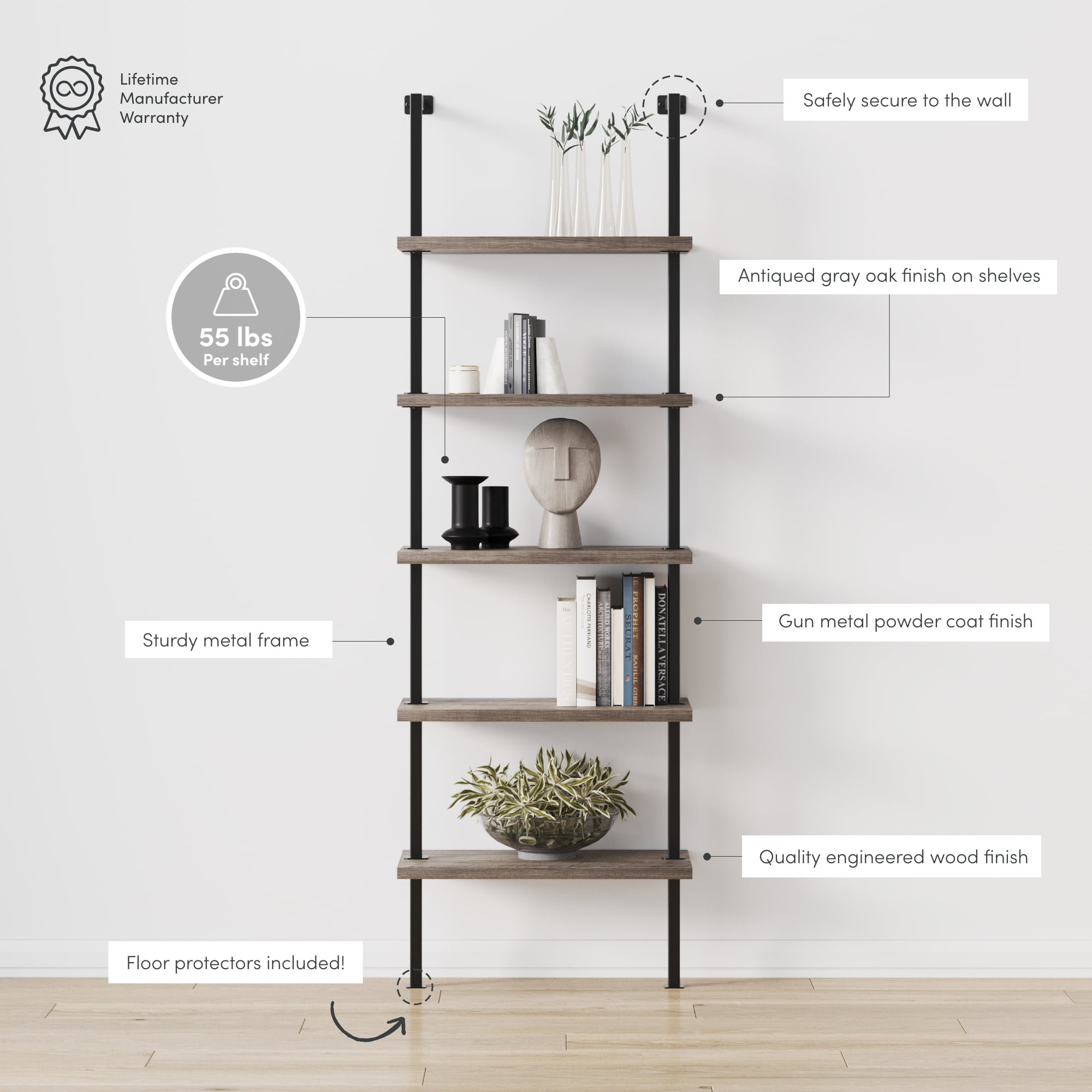 Nathan James Theo 5-Shelf Ladder Bookcase Rustic Gray Oak Wood Black Metal Frame