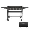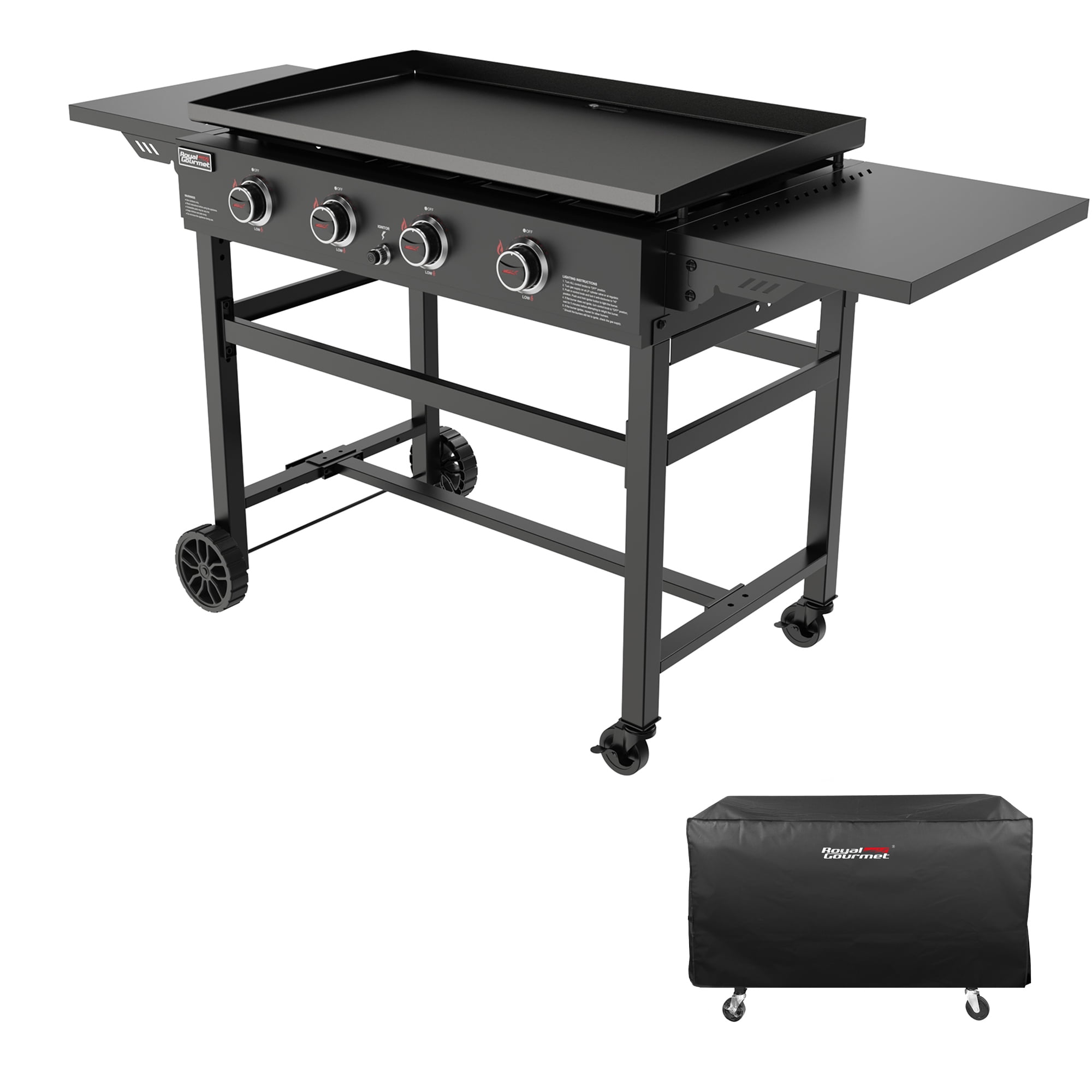 Unlock all the possibilities you may expect from Royal Gourmet® GB4001 4-Burner Propane Gas Griddle. It has a thick, flat griddle plate, measuring 36’’ L x 22’’ W, a total of 792 sq. in surface that is perfect for outdoor BBQ parties! Four powerful stainless-steel tube burners put out overall 52000 BTUs, allowing you to cook various foods at a desired heat. Fixed side tables hold on multiple seasonings with stable construction. Cleaning job is simple and easy: after grilling, you can remove the griddle with a grasp of its side handles. Detach oil cup that collects grease from dripping for fast and easy cleanup. It is also free to move with four locking casters. Cook eggs, pancakes, steak, rice, teriyaki style foods and more with Royal Gourmet® GB4001 4-Burner Propane Gas Griddle!