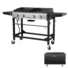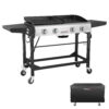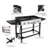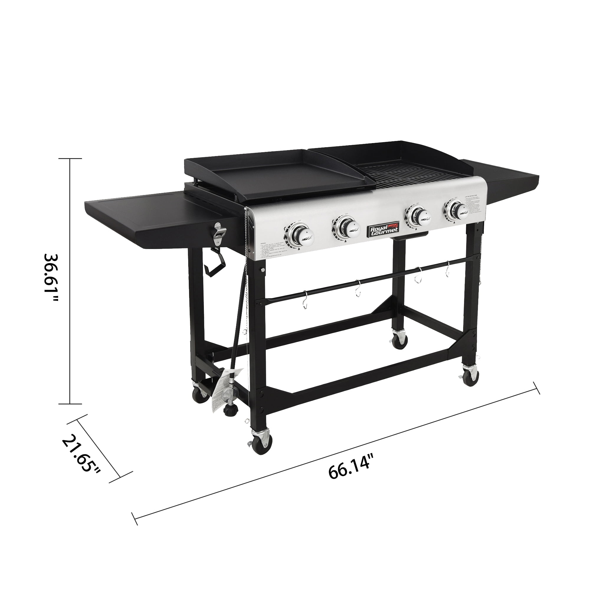 Grill or griddle, that won’t be a problem anymore. Royal Gourmet® GD401 Premium 4-Burner Folding Gas Grill and Griddle helps you achieve both within one product. Its fold-down legs make assembly work fast and easy around 15 minutes. This versatile grill makes it a perfect tailgater grill for your outdoor events, thanks to the combination of grill and griddle, on which you can cook and barbecue however you want. 584 sq. inches cooking area is enough for cooking a variety of foods, be it pancakes, burgers, or rice. Featuring four powerful burners, the grill combo sports 48,000 BTUs output. With a simple push of big knobs on our stainless steel panel, you can start it very quickly. Grill tongs, spatulas hung on the hooks at lower bar are always handy for use. This grill sits on four lockable casters that are flexible to move around.Utilize the grill combo to make favorable cooking and enjoy the free shift of them on either basis. Package GD401 into your car and go for a Sunday camping with family or friends!