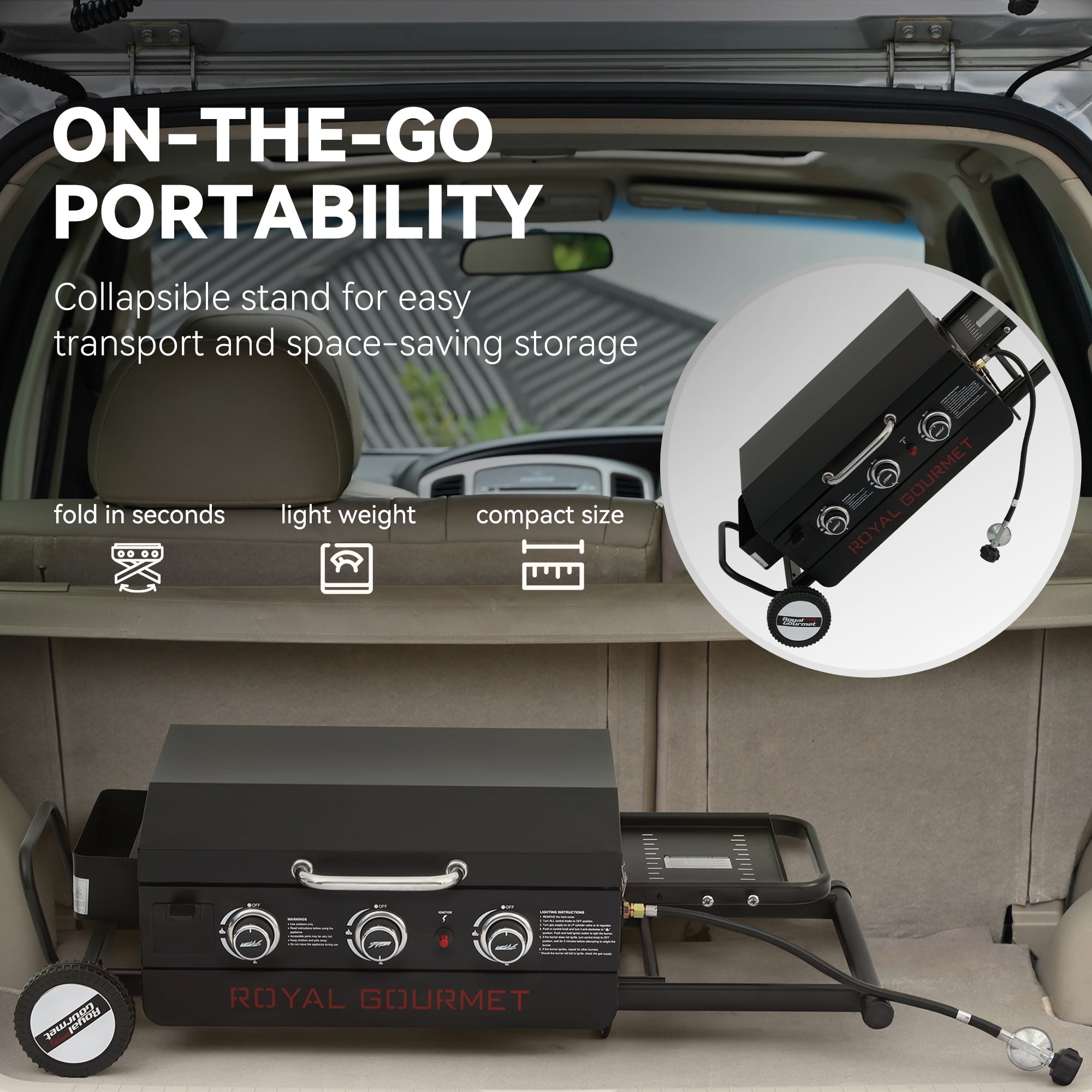 If you are an outdoor enthusiast with on-the-go cooking needs, Royal Gourmet PD3001 23-Inch Portable 3-Burner Gas Griddle with Collapsible Stand is exactly what you are hoping for. The collapsible legs and wheels offer ultimate portability and extremely easy transport, enabling you to easily take this griddle around in your car anytime anywhere, as well as push (or pull) it at will, like moving a compact cart. The collapsible legs also provide you with space-saving storage. While compact, it boasts ample cooking area to make multiple items at once. For added convenience, a side shelf with 2 hooks offers easy access to essentials, and a left spice rack provides a convenient storage solution for seasonings or condiments.