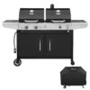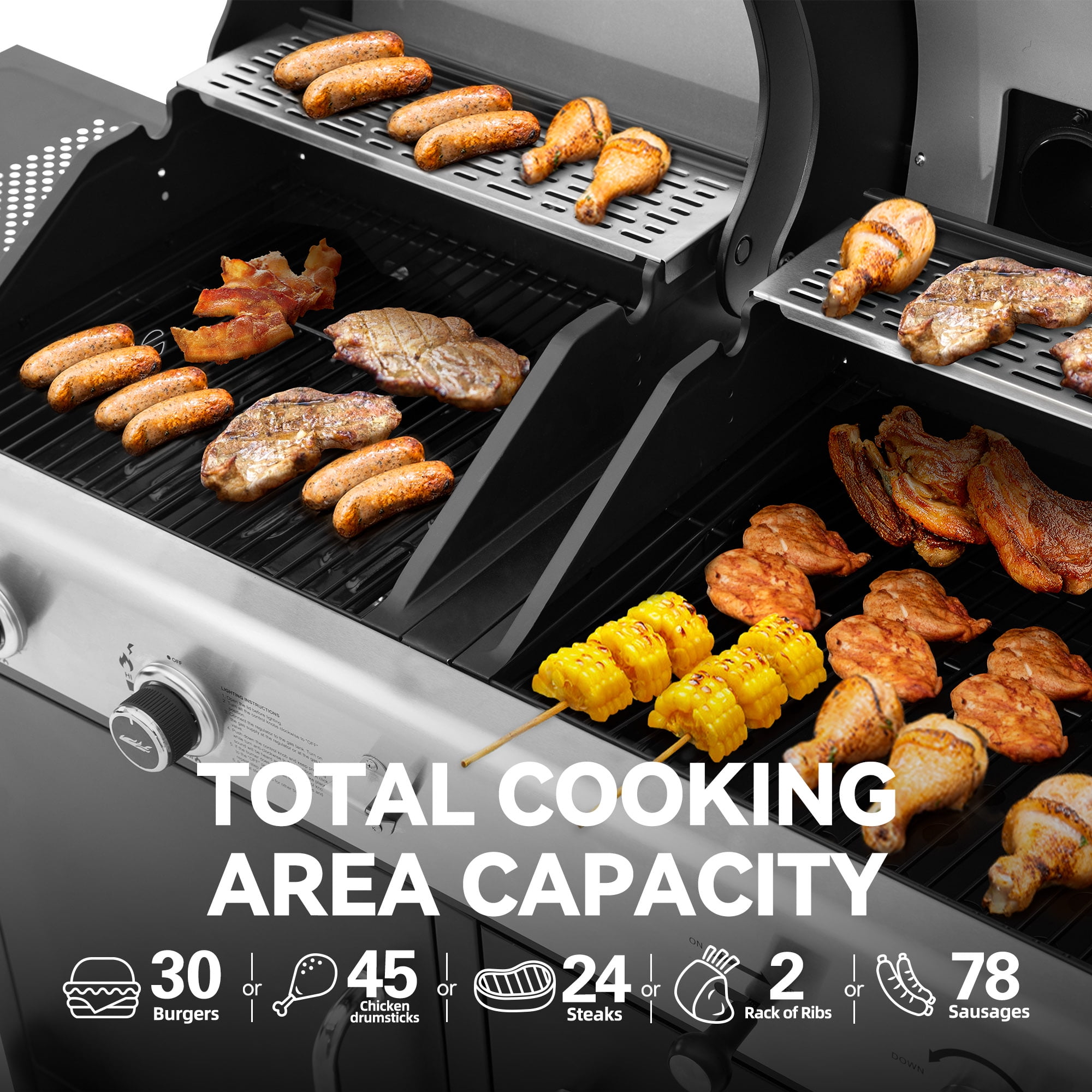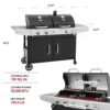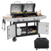 Royal Gourmet ZH3002C gas and charcoal grill combo is constructed of heavy-duty materials. Elegant design together with heat-resistant feature brings you superior barbecue experience. The grill combo comes with 592 square inches porcelain-coated cast iron grates and 169 square inches stainless-steel warming racks, delivering enough cooking space for about 33 patties. Three stainless-steel burners with 25,000 BTUs are durable and excellent in performance. The charcoal grill side provides a height-adjustable charcoal pan allowing for easy control of temperature between heat and your food. Full-size ash pan underneath can be drawn out and offers easy cleanup. Fixed side tables give you plenty of additional working space. Detailed designs such as integrated tool hanging extensions (S hooks not included), bottle opener are friendly features making your barbecue enjoyable and leisurely. The grill is freely to move around the combination of 2 casters and 2 wheels realizes convenient movement and meanwhile provides sturdy foundation for grilling.