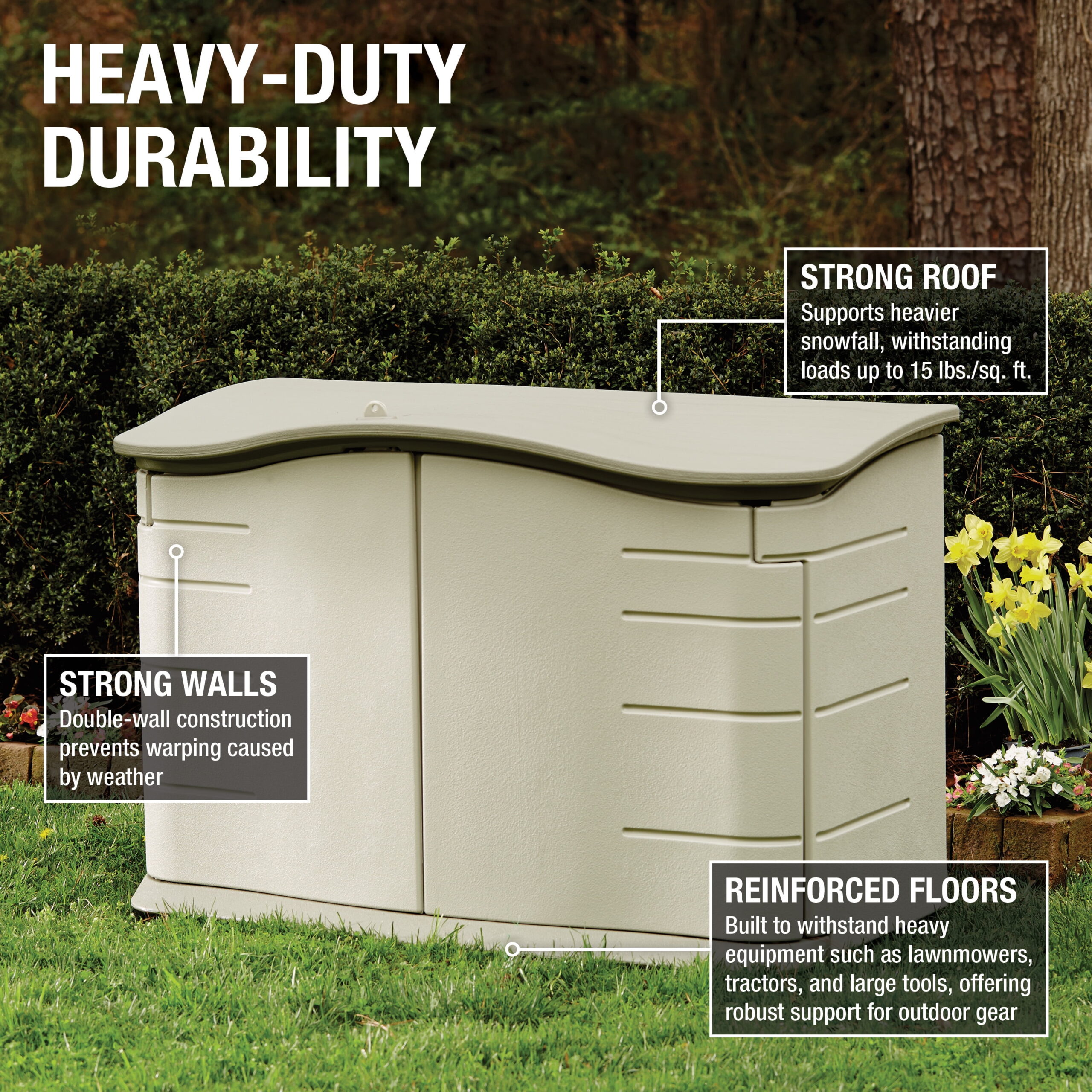 Rubbermaid Outdoor Storage Sheds not only look good but are built to last through any weather. The Rubbermaid Horizontal Storage Shed keeps outdoor tools safe and can be locked for extra security. With two front doors and a top opening, you have easy access to a roomy storage space. It’s a durable and secure solution that complements your home and yard.