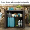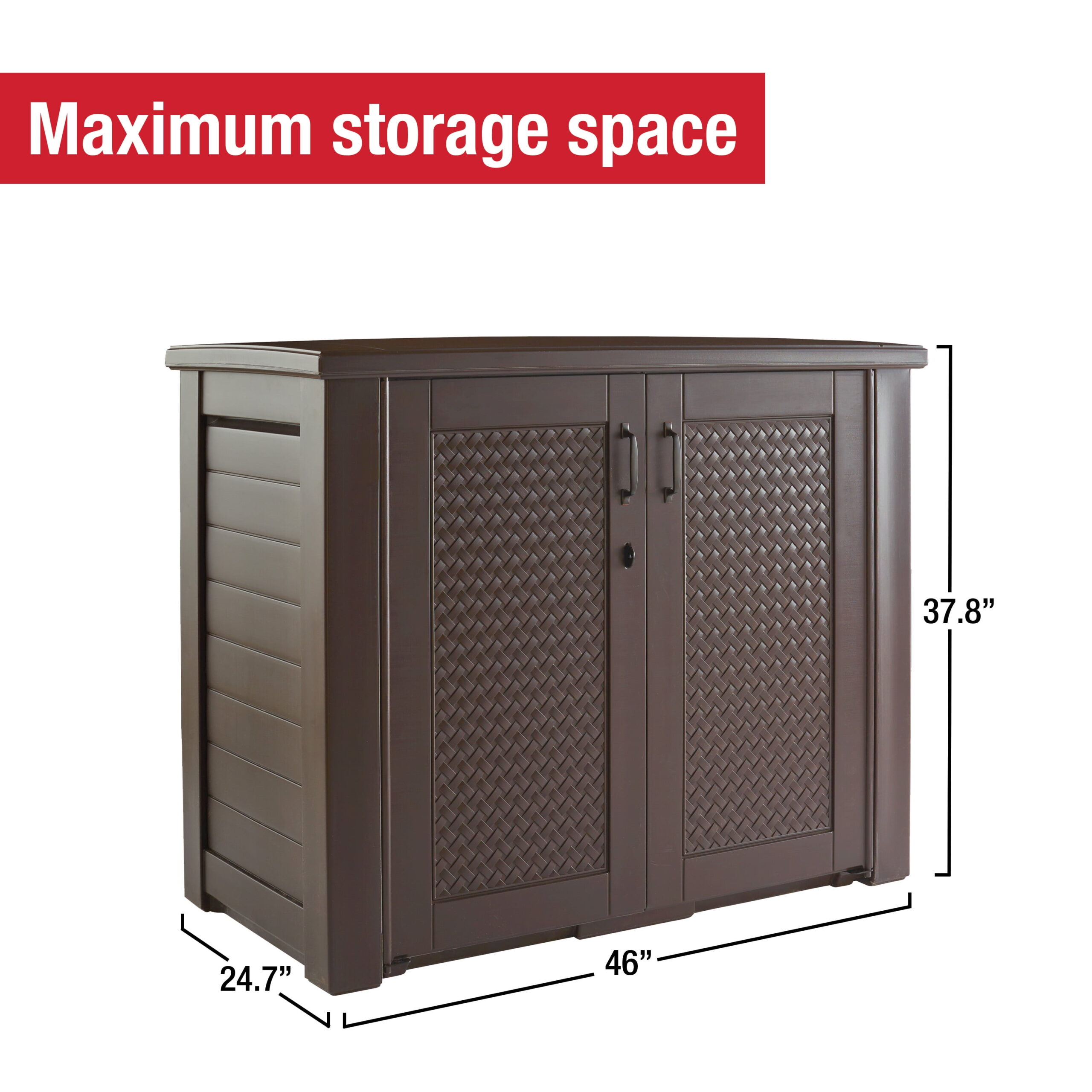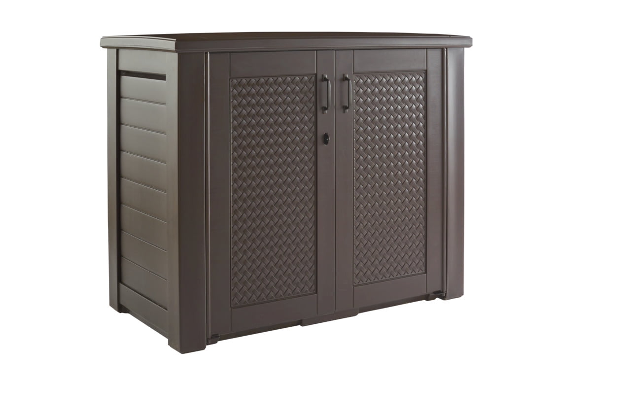 The Rubbermaid Patio Cabinet features a basket weave pattern to complement your decor. An extra-large storage space inside holds seat cushions, garden supplies and grilling accessories. There is an adjustable shelf included. Lockable for extra security (lock sold separately). Cabinet is made of weather resistant plastic resin that will protect your things from sun, rain and snow. Top level surface provides entertaining space. Full-length double doors.