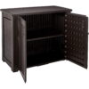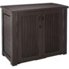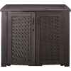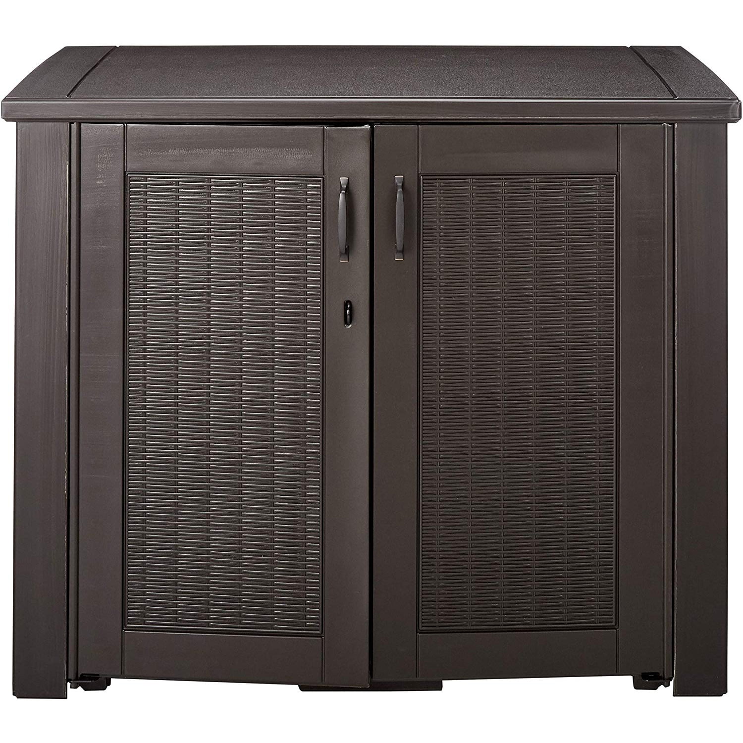 Keep your deck neat and tidy and have a place for all of your things with the Rubbermaid Patio Chic Outdoor Cabinet Style Wicker Storage Deck Box. Crafted out of durable wicker material, this cabinet-style storage box is designed to offer simple storage and complement your other outdoor furniture. It features ample storage space and is a great spot to store things like couch/chair cushions, garden supplies, grilling accessories, kids’ toys, and more. This deck box is made from weather-resistant material and won’t break down due to weather elements like sun, rain, and snow. Unlike imitator deck boxes, this model, like all Rubbermaid deck boxes, are made .. Don’t settle for a clunky or unorganized back patio. Instead, keep things tidy with the Rubbermaid Patio Chic Outdoor Cabinet Style Wicker Storage Deck Box.