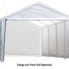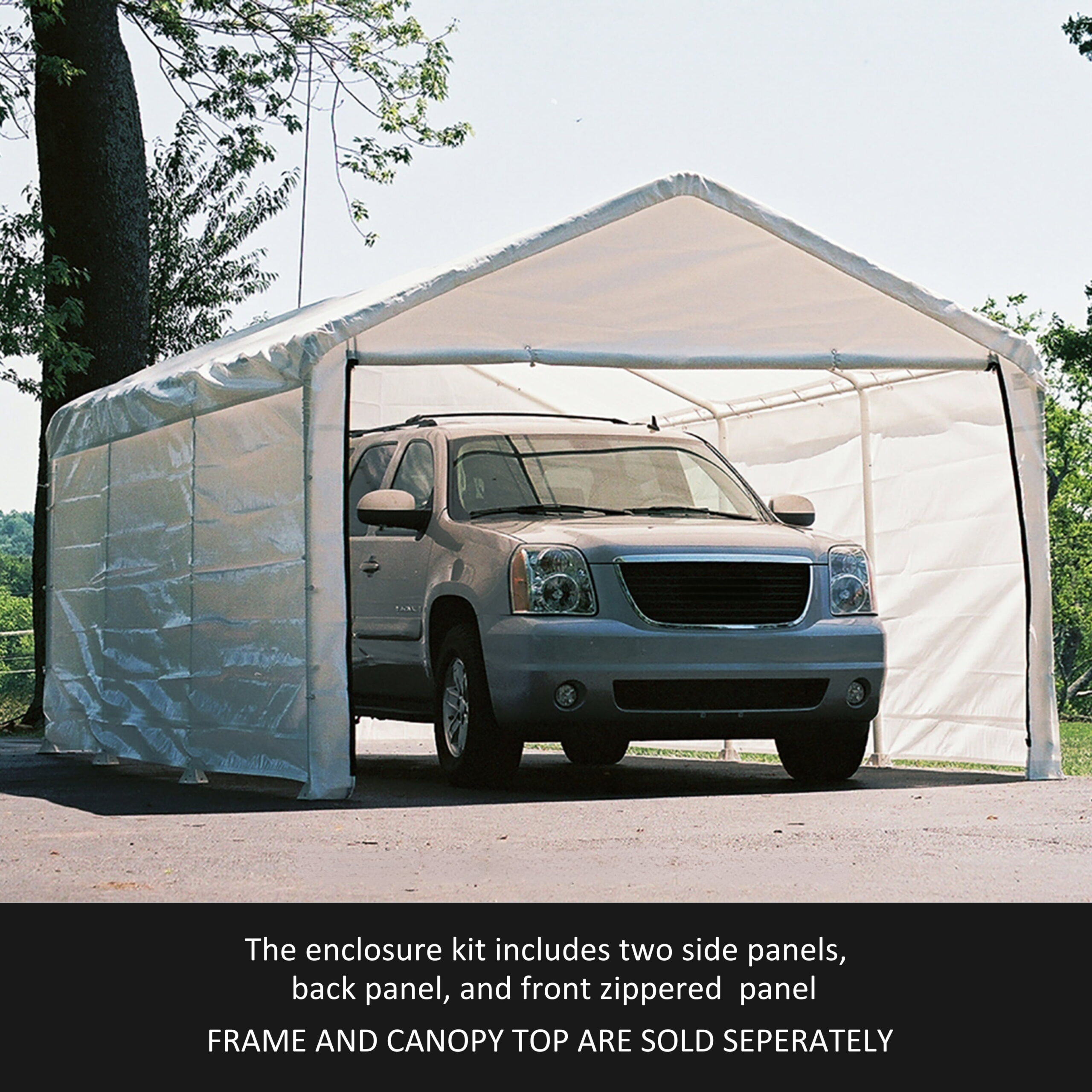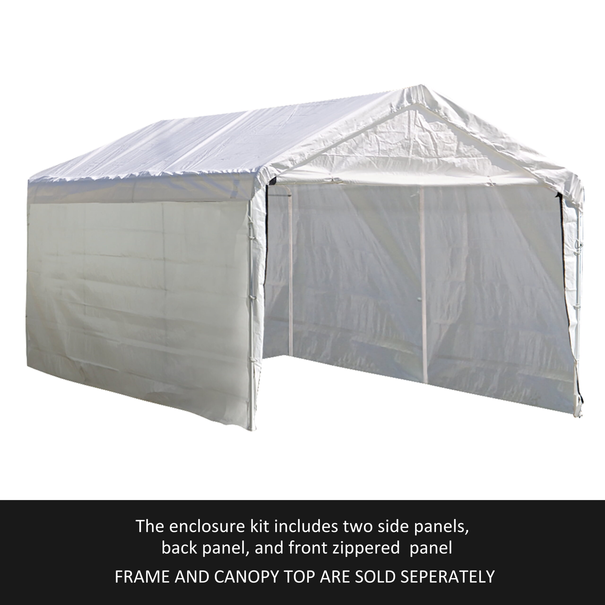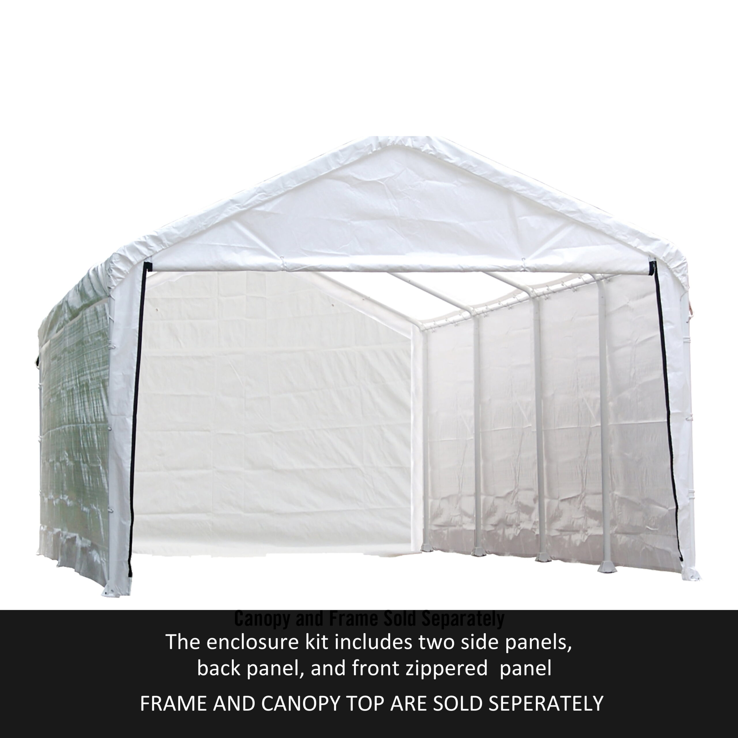 The ShelterLogic 12 ft. x 26 ft. SuperMax Canopy Enclosure kit allows you to expand Your canopy options. Quickly convert your SuperMax 12×26 canopy into a functional, low cost, enclosed seasonal shelter in minutes. Complete ready to install kit attaches in minutes to your existing frame with bungee fasteners. All constructed to the exact frame specifications of the 12×26 SuperMax Canopy.ENCLOSURE KIT ONLY – CANOPY FRAME AND COVER SOLD SEPARATELY. Fits all 12 x 26 ft. SuperMax 2 in. diameter canopies.. Heat sealed seams not stitched for a stronger bond. 100% water resistant. Constructed of ripstop woven polyethylene fabric. 50+ UPF Sun Protection blocking 98% of harmful UV Rays. Added UV protection, fade blockers, anti-aging, anti-yellowing and anti-microbial agents. UV protection treated inside, outside and in between. Quick and easy set-up attached to canopy frame in minutes with bungee fasteners, reuse your existing bungees or reorder.