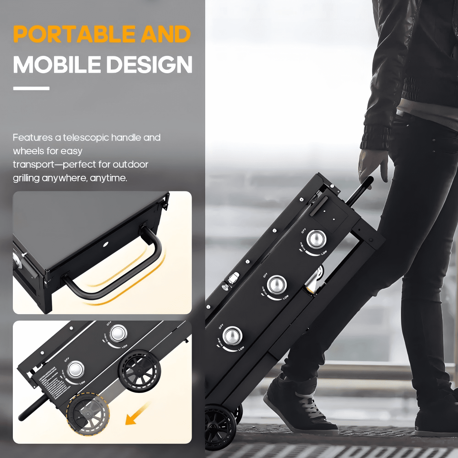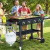 This family-friendly portable gas grill is a must-have for any BBQ enthusiast. Boasting 60,000 BTUs, it heats up quickly and efficiently, with four control knobs to adjust the temperature of each of the four individual burners. The handle design makes it easy to put on and take off the griddle plate, while the waste oil cup collects waste oil and the grease catch pan prevents oil from dropping. The cylinder holder base provides a secure place for your gas cylinder, and its versatile cooking capabilities allow you to cook a range of foods including eggs, pancakes, bacon, steak, and potatoes. It’s ideal for use on your patio, in your garden, or in your backyard. Assembly is made easy with the clear instructions provided, and the smooth surface ensures effortless cleaning. Don’t hesitate to order this Portable Gas Grill today!