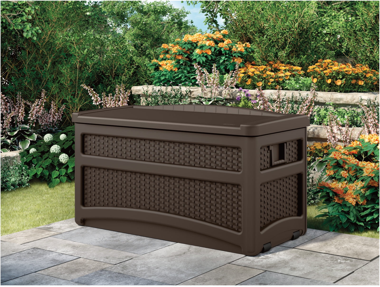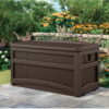 Keep your patio as neat as your home with the Suncast 73-Gallon Deck Storage Box and Bench. A convenient storage solution for use outdoors, this spacious 73-gallon outdoor storage bin fits everything from patio furniture to gardening tools. Constructed from durable resin, this deck storage box requires little maintenance and holds up all year long. The unique, stay-dry design protects the contents you place inside from rain, snow, and other moisture. Thanks to the built-in handles and wheels, you can easily move this box to wherever you need extra storage. The attractive java color makes it easy for this box to fit into your existing outdoor decor.
