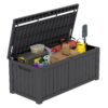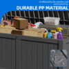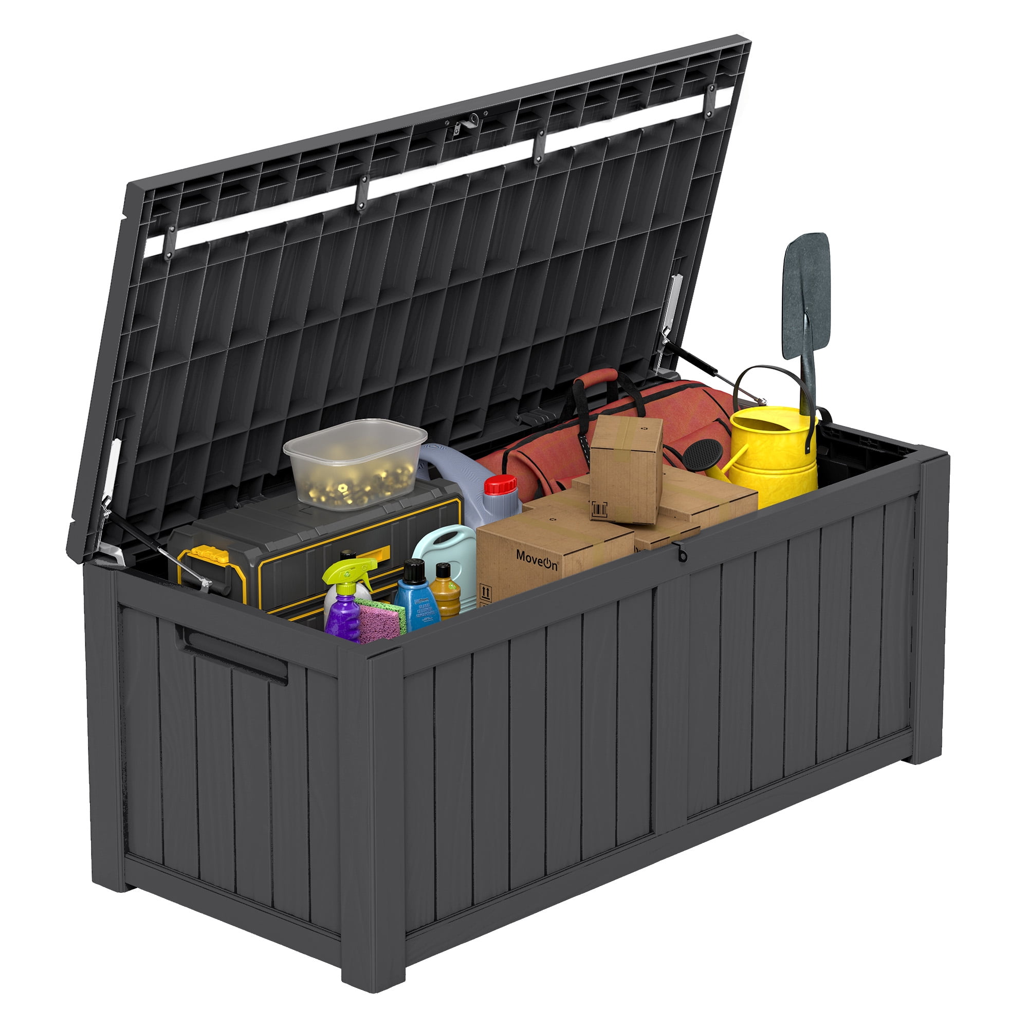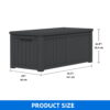 Upgrade your outdoor living space with our 120 Gallon Large Resin Deck Box. Crafted from weatherproof resin, this spacious storage solution offers ample room for patio cushions, gardening tools, and more. Featuring a lockable lid, your belongings remain secure, while the Dark Grey finish seamlessly complements your patio decor,Durable and waterproof.