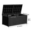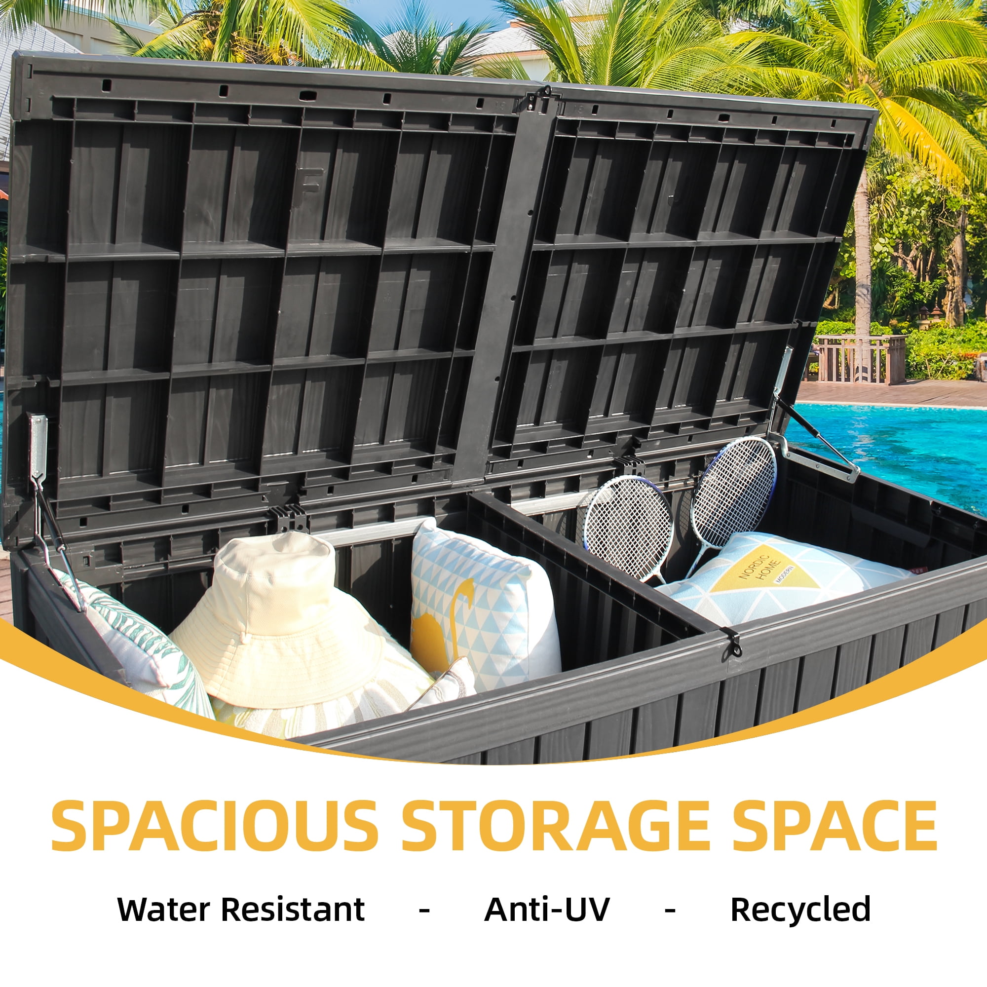Experience the spacious and organized storage capabilities of the Extra-Large Outdoor Storage Deck Box. With its upgraded structure featuring a built-in divider, you can easily organize your outdoor clutter. This deck box offers an immense 150-gallon storage capacity, making it perfect for a wide range of items. The installation process requires at least two people and specific tools, ensuring a waterproof and durable finished product. The premium material, including strong support hydraulic rods and a smooth PP surface with wood grain imitation, guarantees durability and ease of maintenance. This versatile deck box can store various items such as furniture cushions, outdoor toys, gardening tools, and pool accessories.