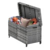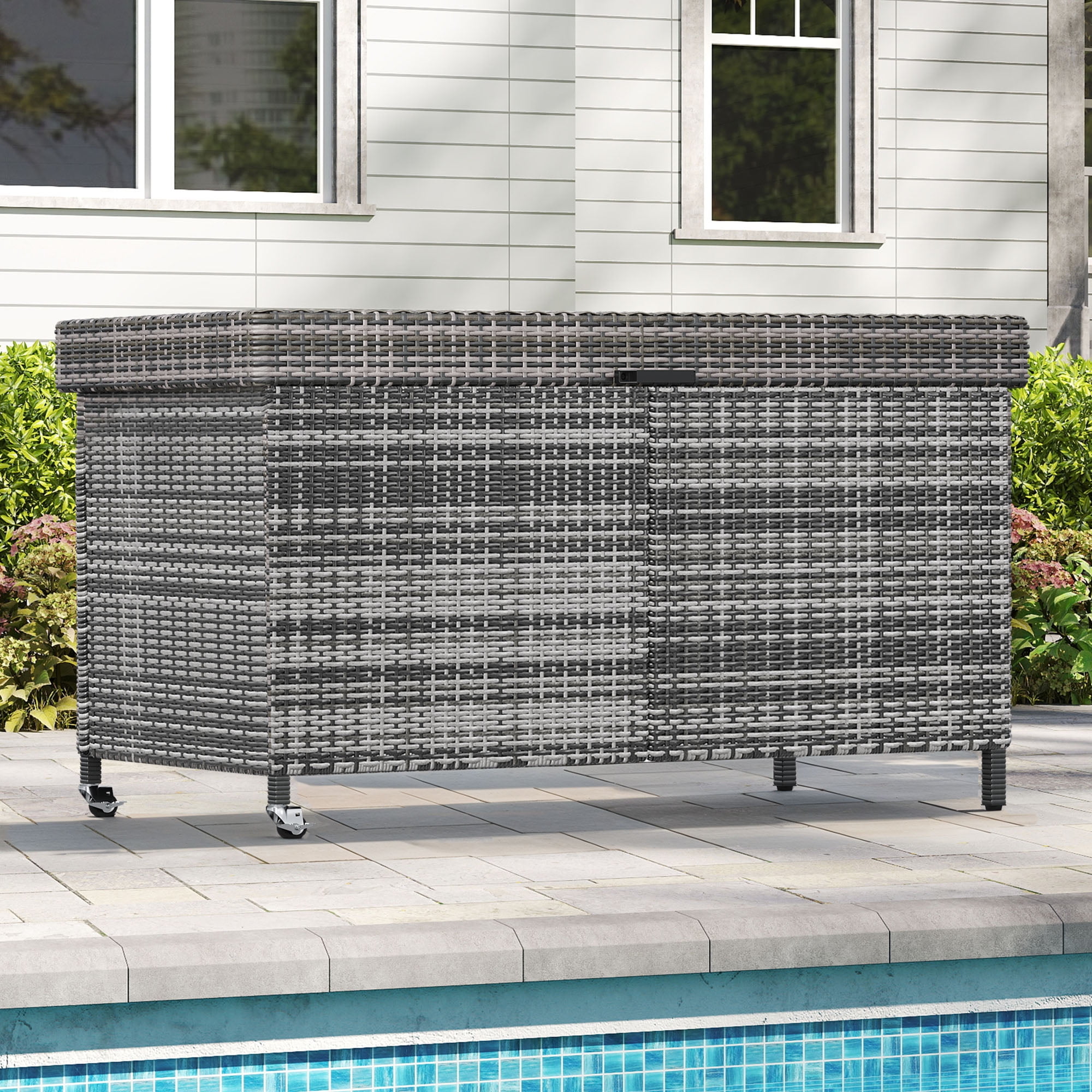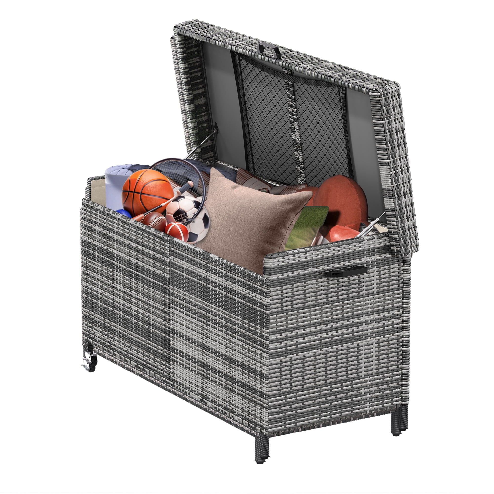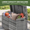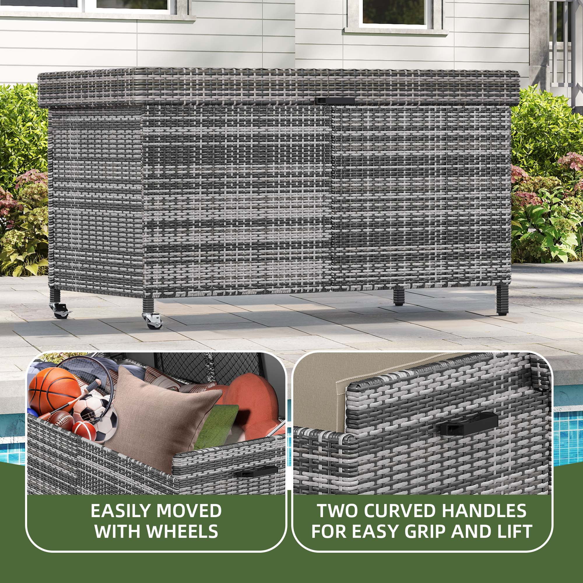 Store all your patio cushions, pool supplies, and gardening gear in this versatile deck box with 200-gallon capacity and built-in mesh pocket. The multi-functional flat top doubles as extra seating or a side table, while smooth-rolling wheels make relocation easy. Made from weatherproof PE rattan and rust-resistant steel, it withstands sun, rain, and snow. Features include dual brakes for stability, a soft-close lid, and quick tool-free assembly. Ideal for decks, patios, or poolside storage.