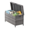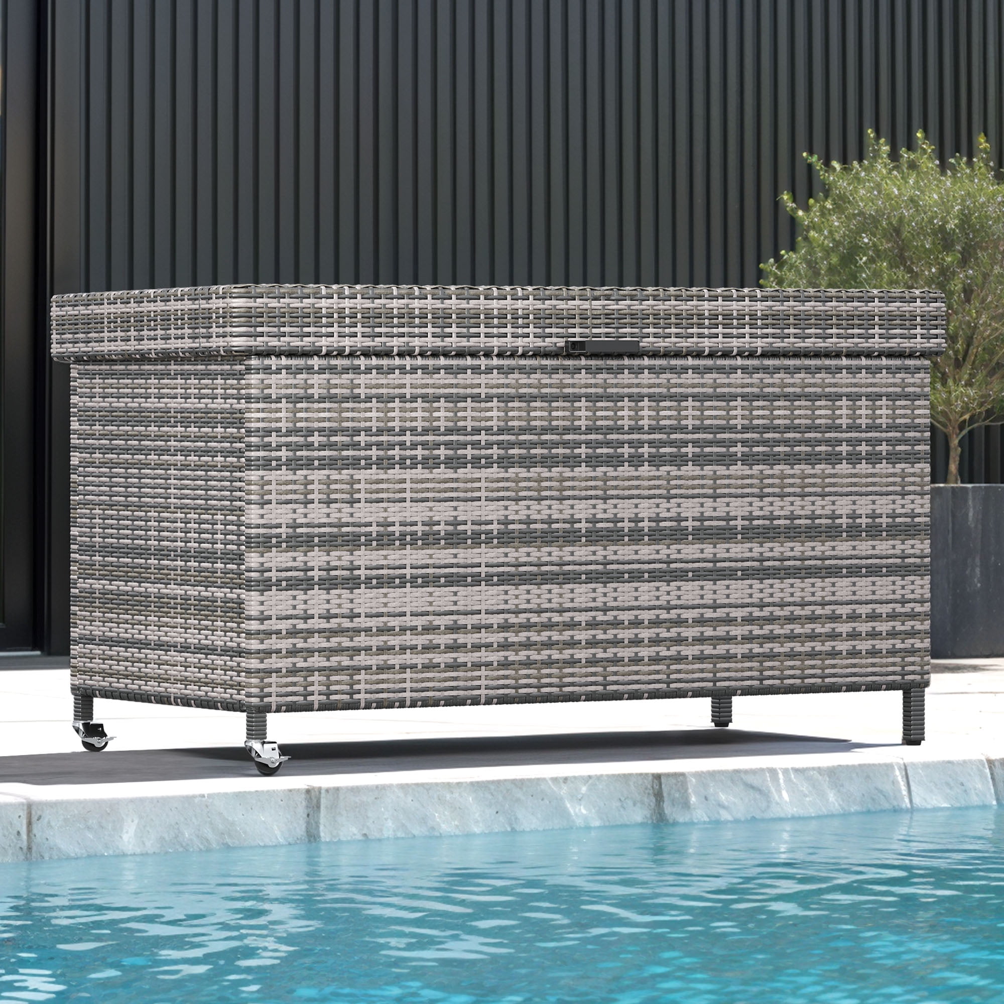 The 200-gallon deck box offers the ideal place for cushions, garden tools, pool supplies, and more. Its weatherproof design keeps everything dry, while the sturdy rattan adds a stylish touch. The built-in storage net organizes small items. Plus, movable wheels with brakes make it easy to move and lock in place, while the hydraulic system ensures smooth, effortless opening. Say goodbye to mess and hello to a functional patio.
