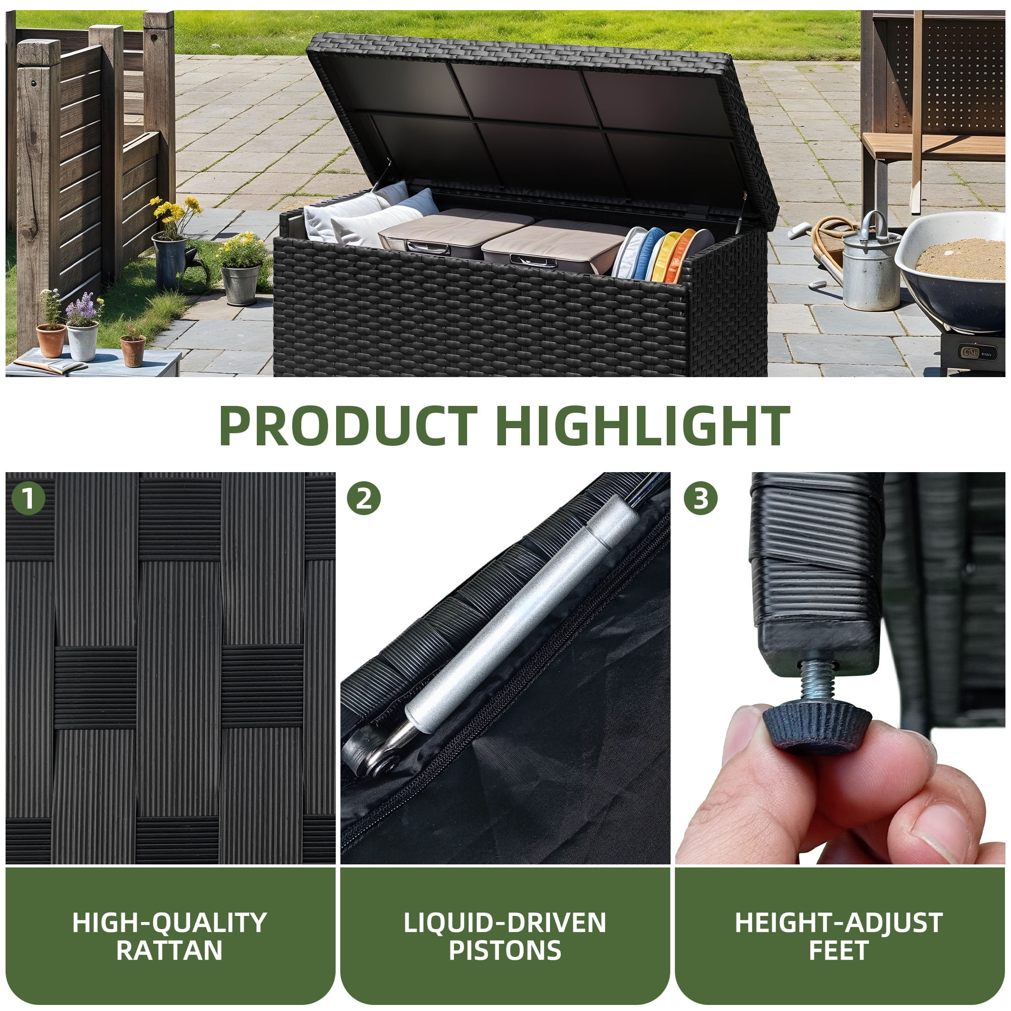 Transform your outdoor space with this elegant and functional wicker storage box. With a spacious 230-gallon capacity, it easily stores pool floats, cushions, garden tools, and more, keeping your patio clutter-free. The waterproof top and super-tough polyester storage bag protect your belongings from rain and weather, ensuring they stay dry and ready for use.
