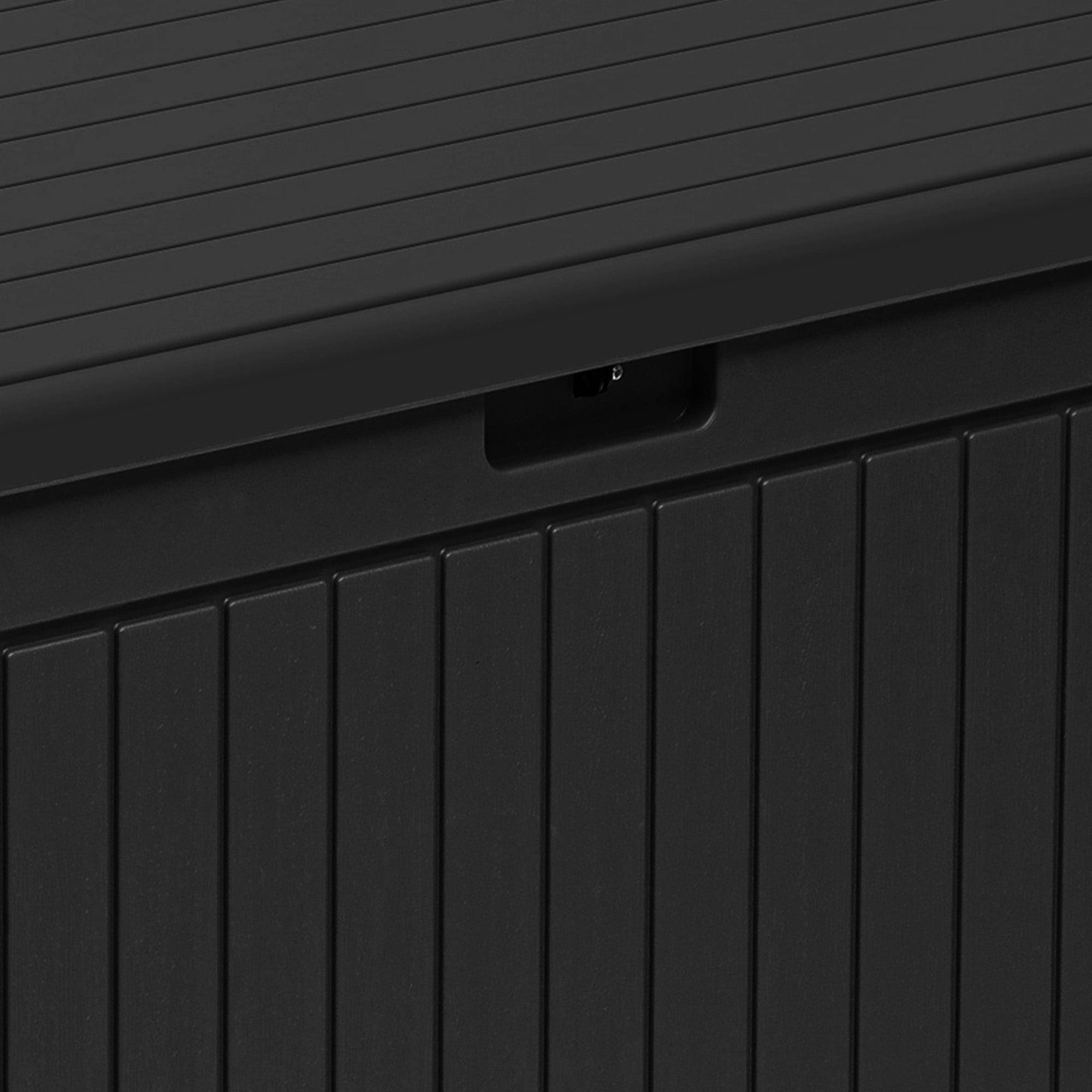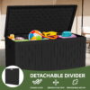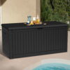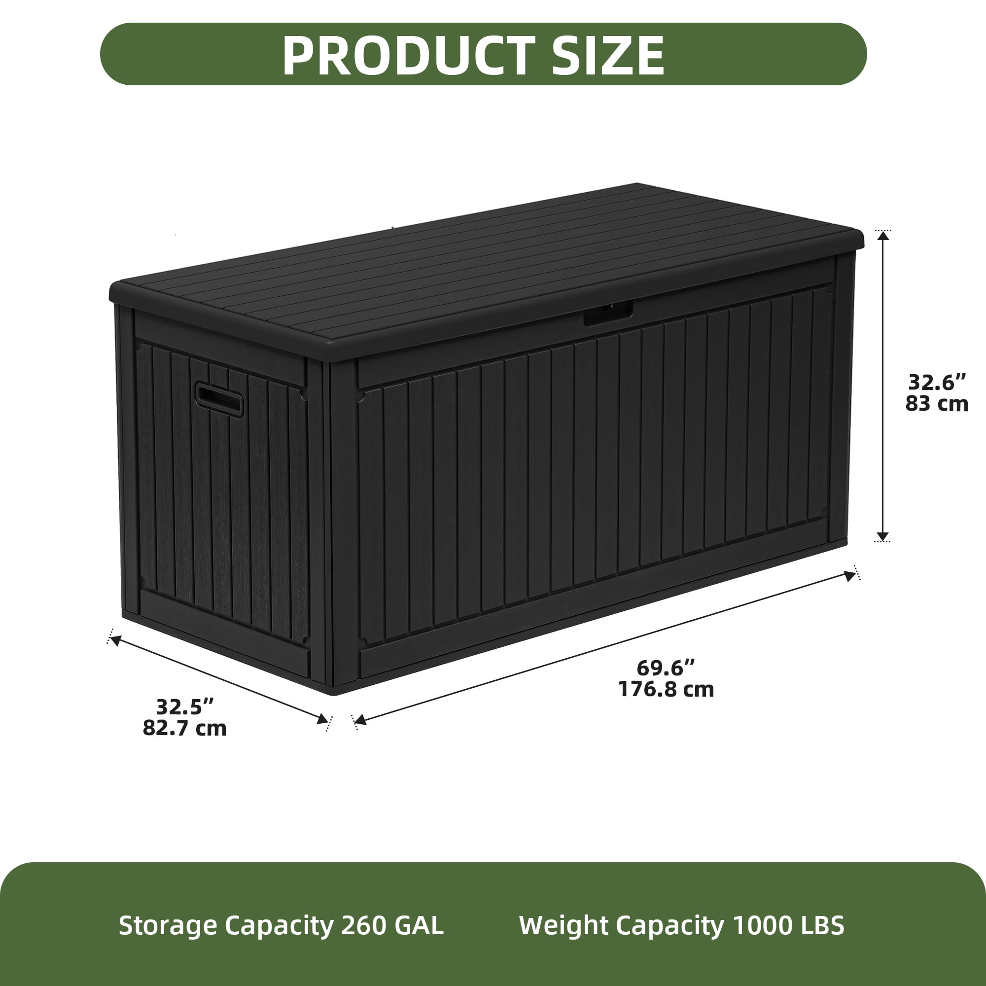 The 260 Gallon Extra Large Outdoor Deck Box offers generous storage for your patio or yard. This double-wall resin storage box features a flexible divider and is lockable and weatherproof. With a sleek black finish, it complements any outdoor decor.