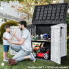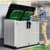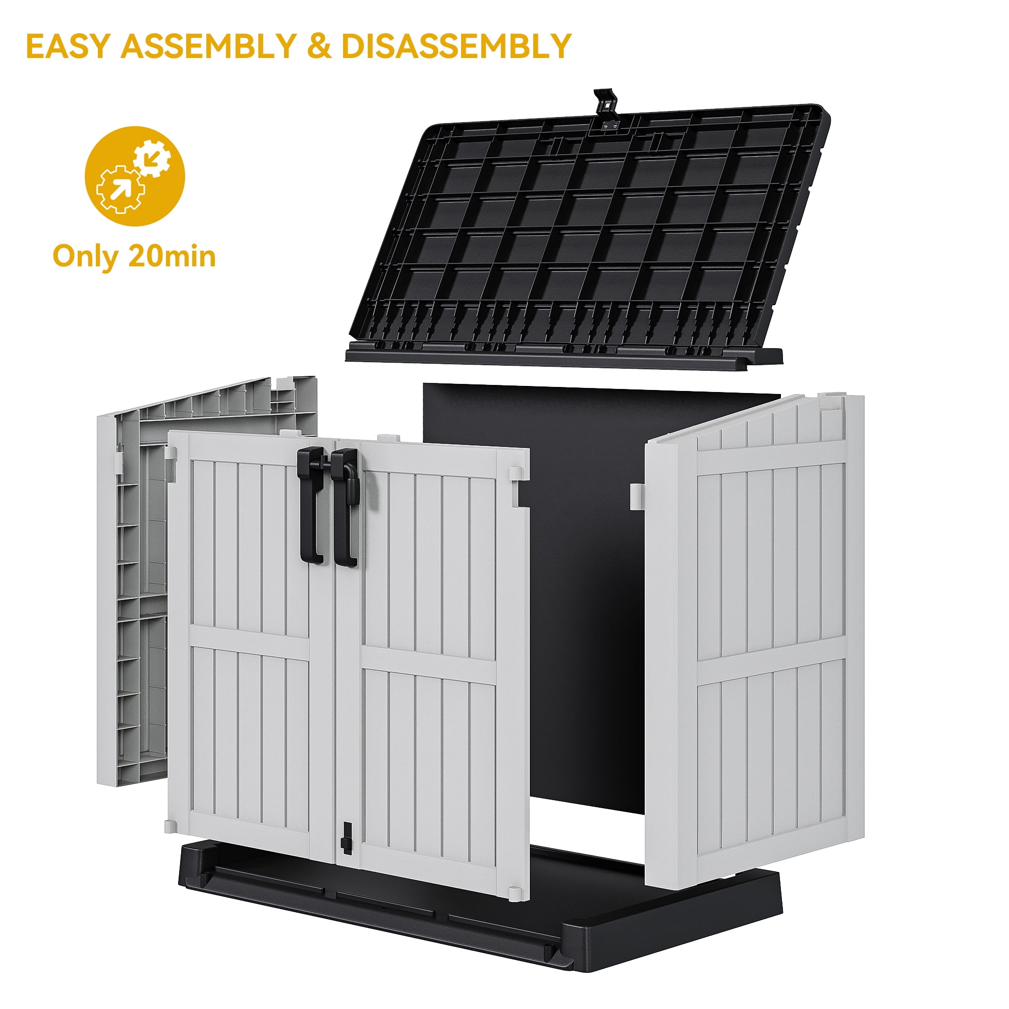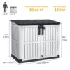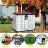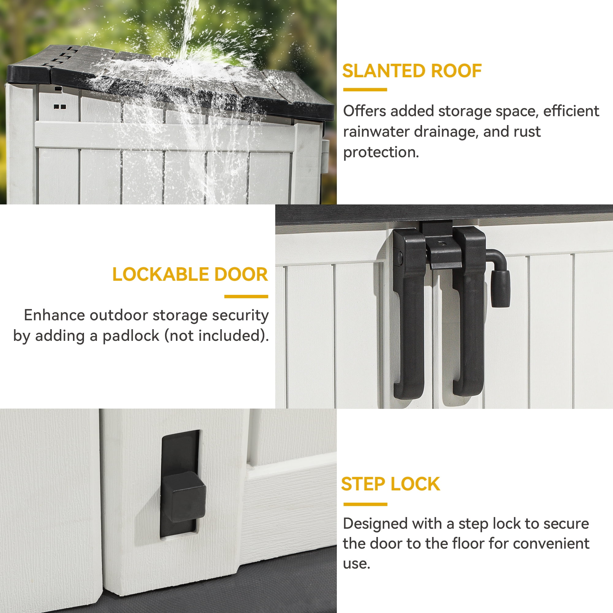 Keep your patio, garage, or backyard organized with this 36 cu ft resin outdoor storage shed. Suitable for modern, rustic, or utility-style spaces, it’s crafted from durable, weather-resistant resin with a woodgrain finish that won’t fade or crack. The sloped lift-up roof offers rain protection, while dual front doors provide easy access. Lockable design (lock not included) keeps tools, trash cans, and gear safe year-round.