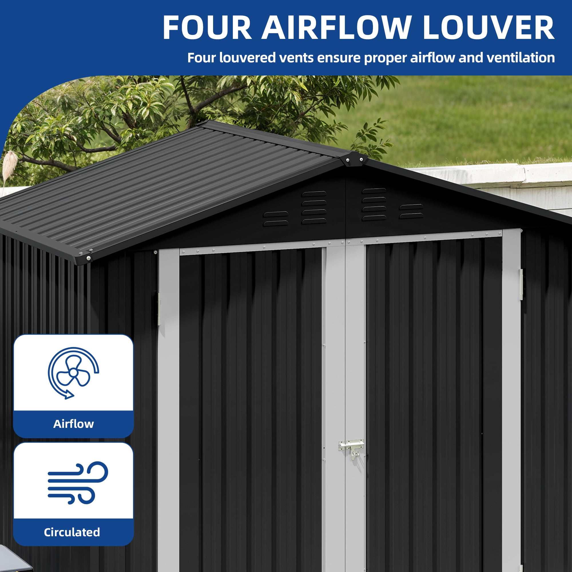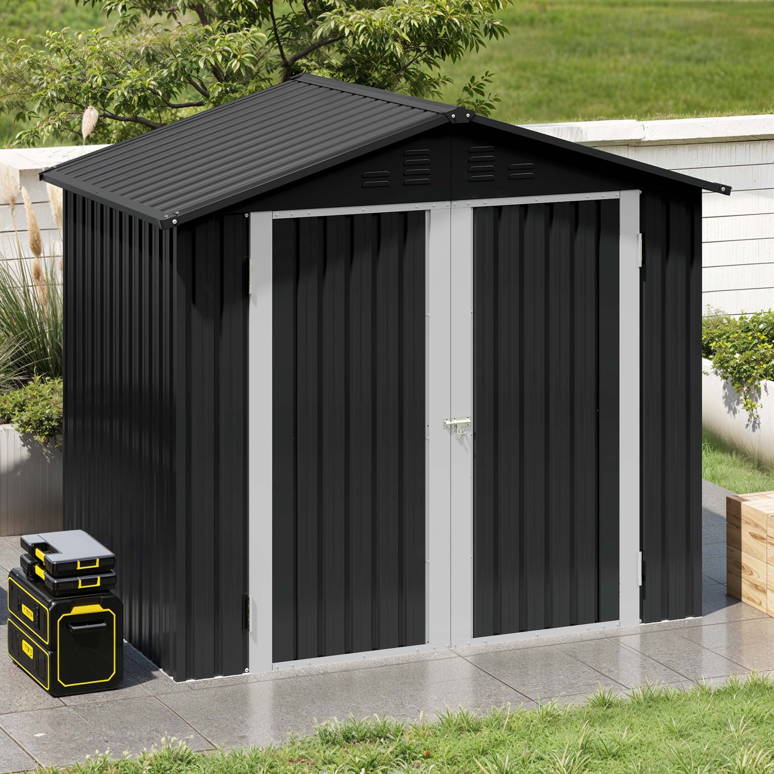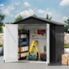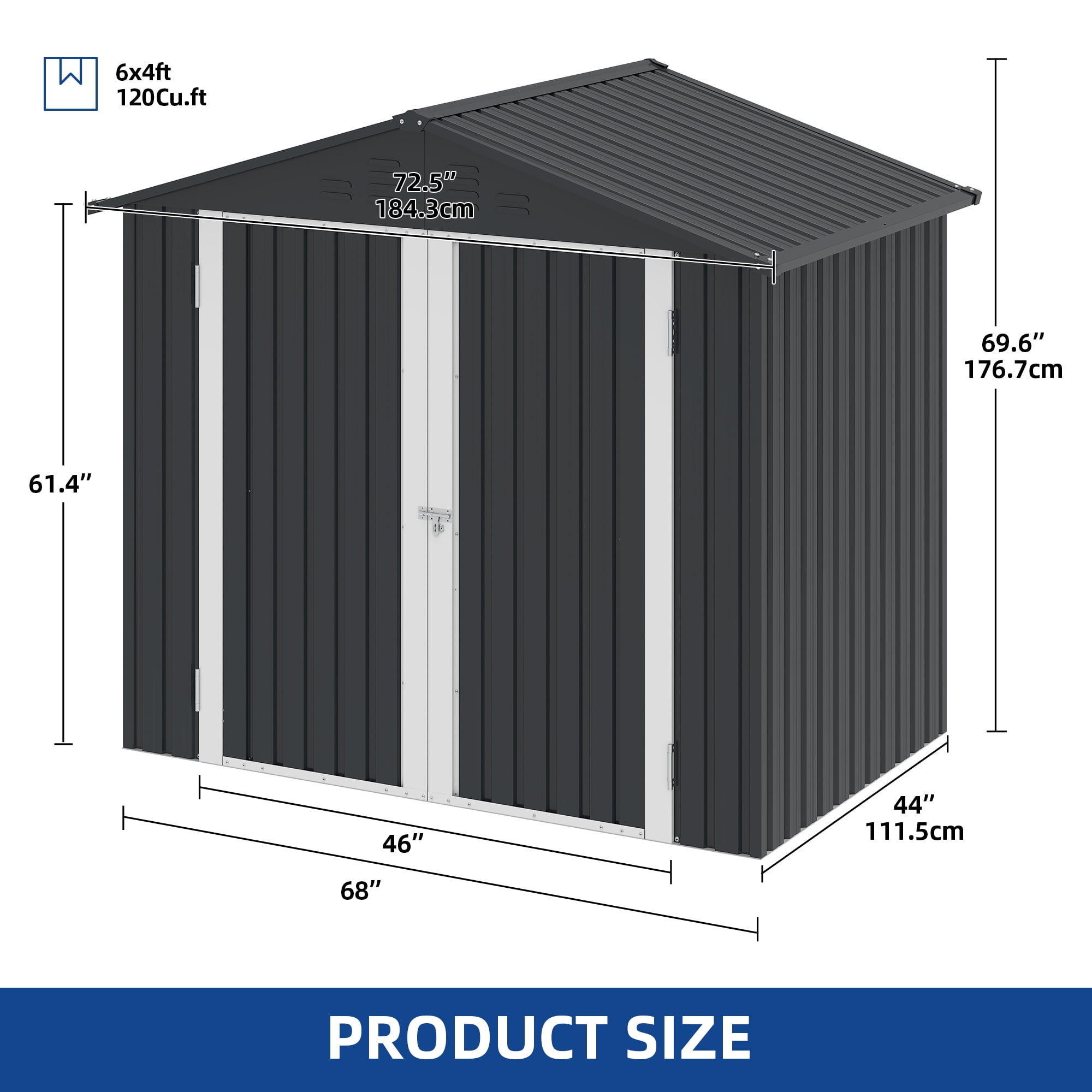 Get serious about outdoor storage with this 6′ x 4′ tool shed. Its galvanized steel construction, enhanced by a protective film, ensures waterproof and rust-resistant longevity. Practical features include dual hinged doors, vented airflow, and ample vertical space, making it functional for organizing tools, bikes, and garbage bins. Designed to integrate flawlessly with modern outdoor settings.