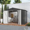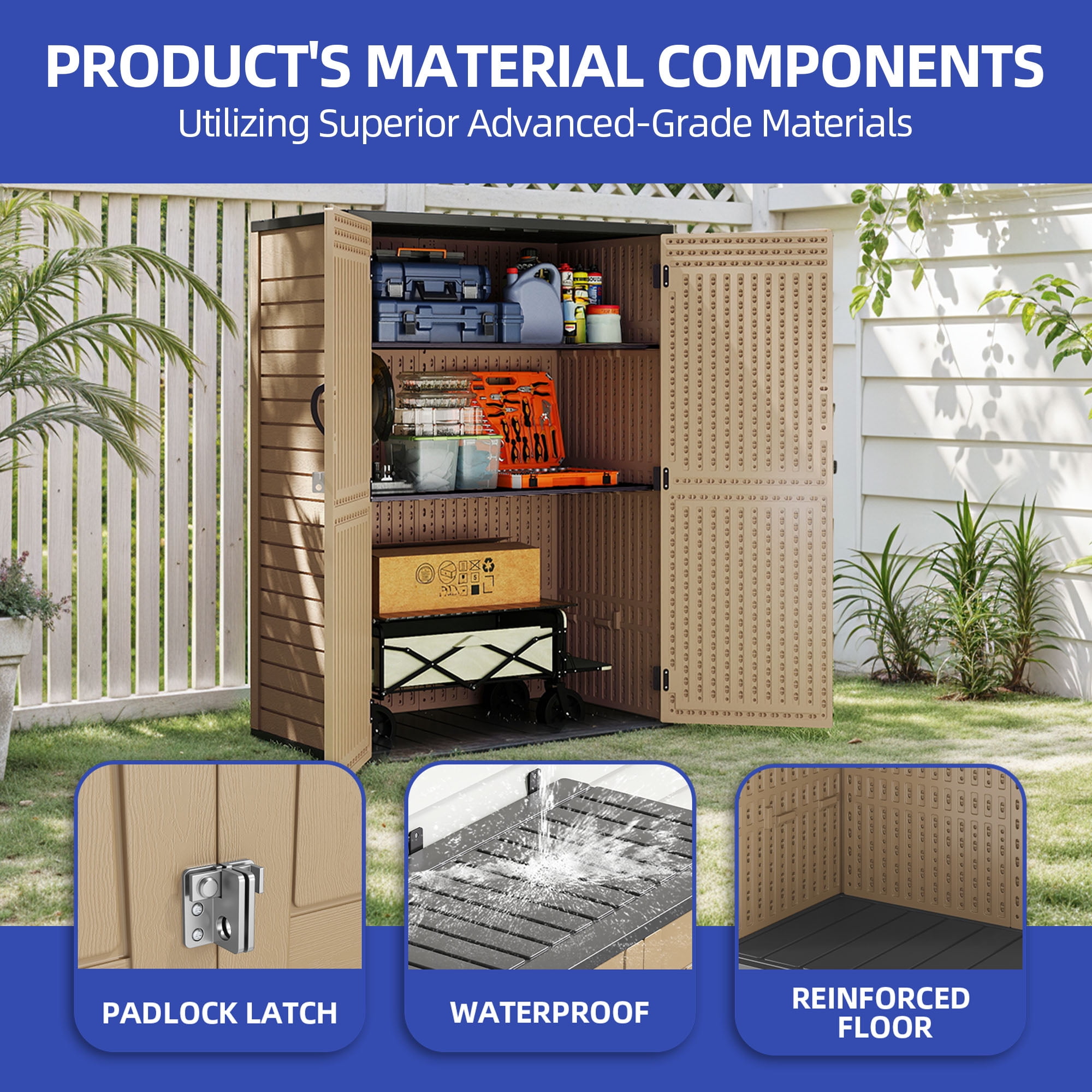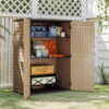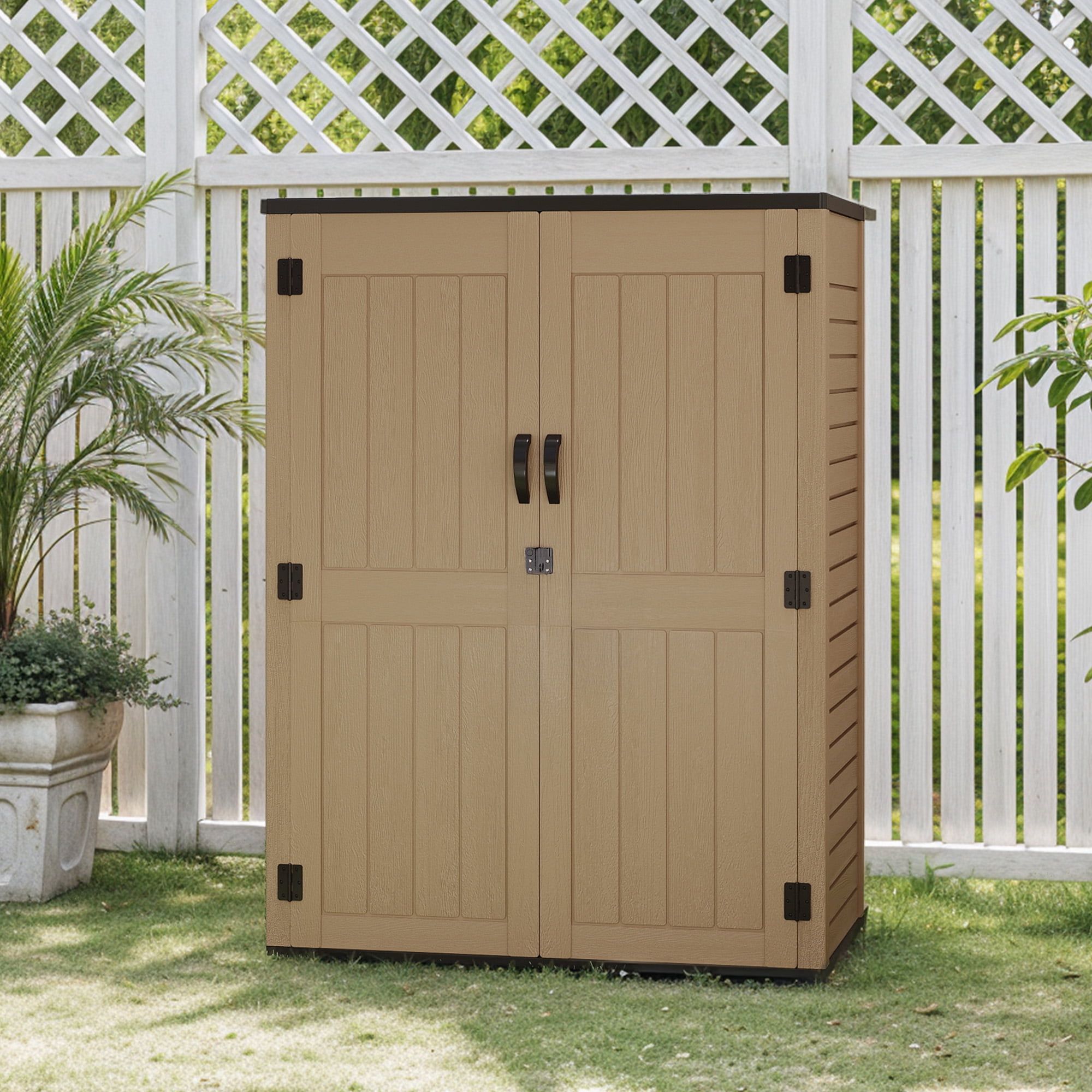 Tidy up your outdoor space with this 59 cu ft outdoor tall storage shed, ideal for gardens, garages, patios, or poolside. Made from heavy-duty HDPE with a realistic wood-grain texture, it resists cracking, fading, and rust. This vertical waterproof resin shed features lockable double doors for security and built-in shelf supports for adjust organization. A durable solution for stylish outdoor storage.