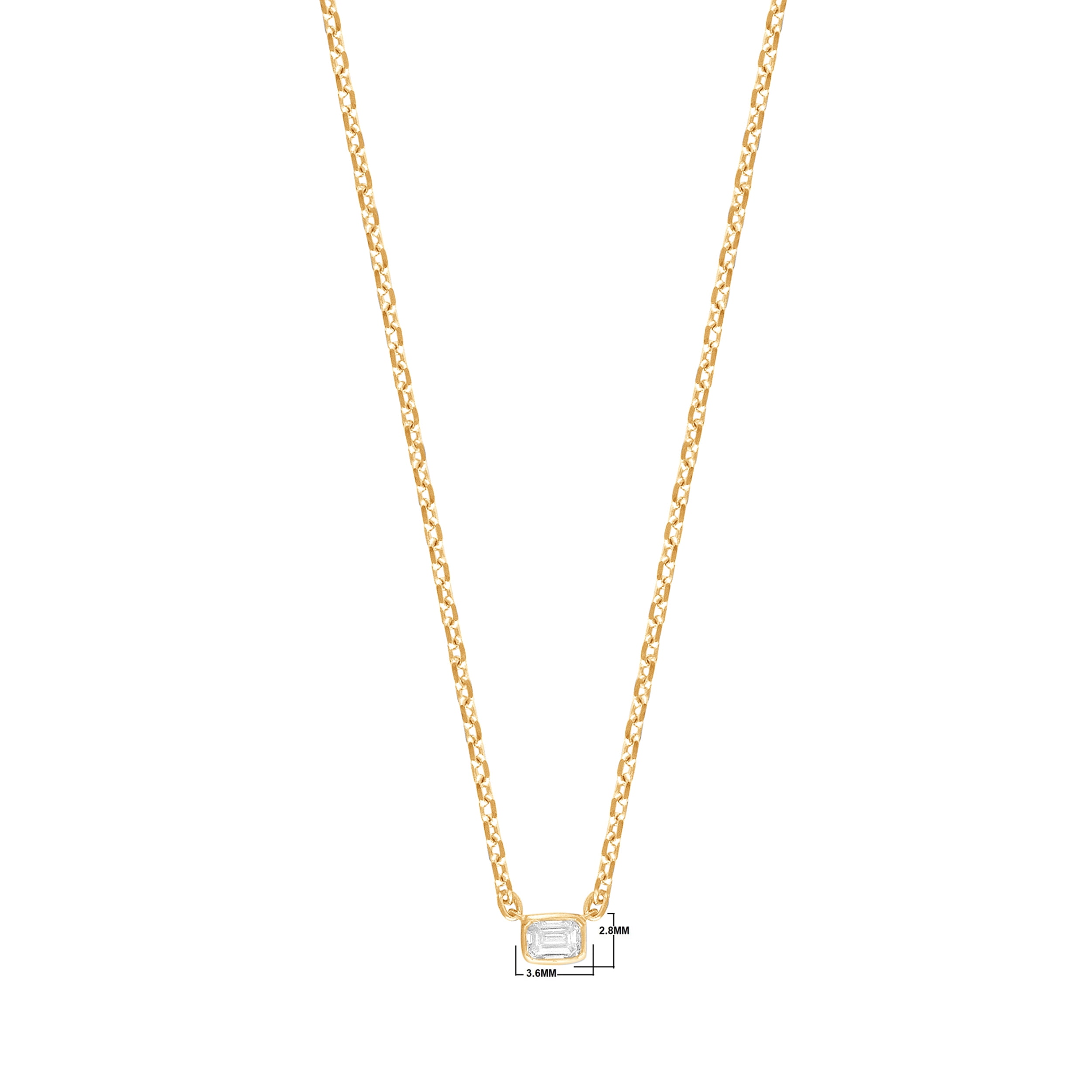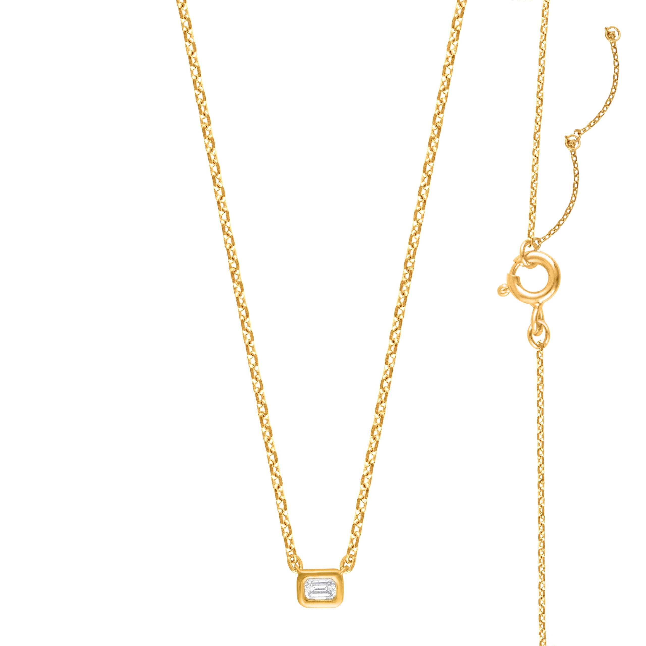 Unique Moments 1/10 ct Emerald Lab Grown Diamond Necklace in Sterling Silver (J, SI-I1). Perfectly petite, this vintage-inspired diamond necklace is an adorable look she’ll never want to take off. Crafted in sterling silver, this anytime style showcases a sparkling 1/10 ct. emerald-cut lab grown diamond solitaire in an intricate milgrain-lined bezel setting. Polished to a bright shine, this design suspends centered along an 18.0-inch cable chain that secures with a Spring claw clasp.