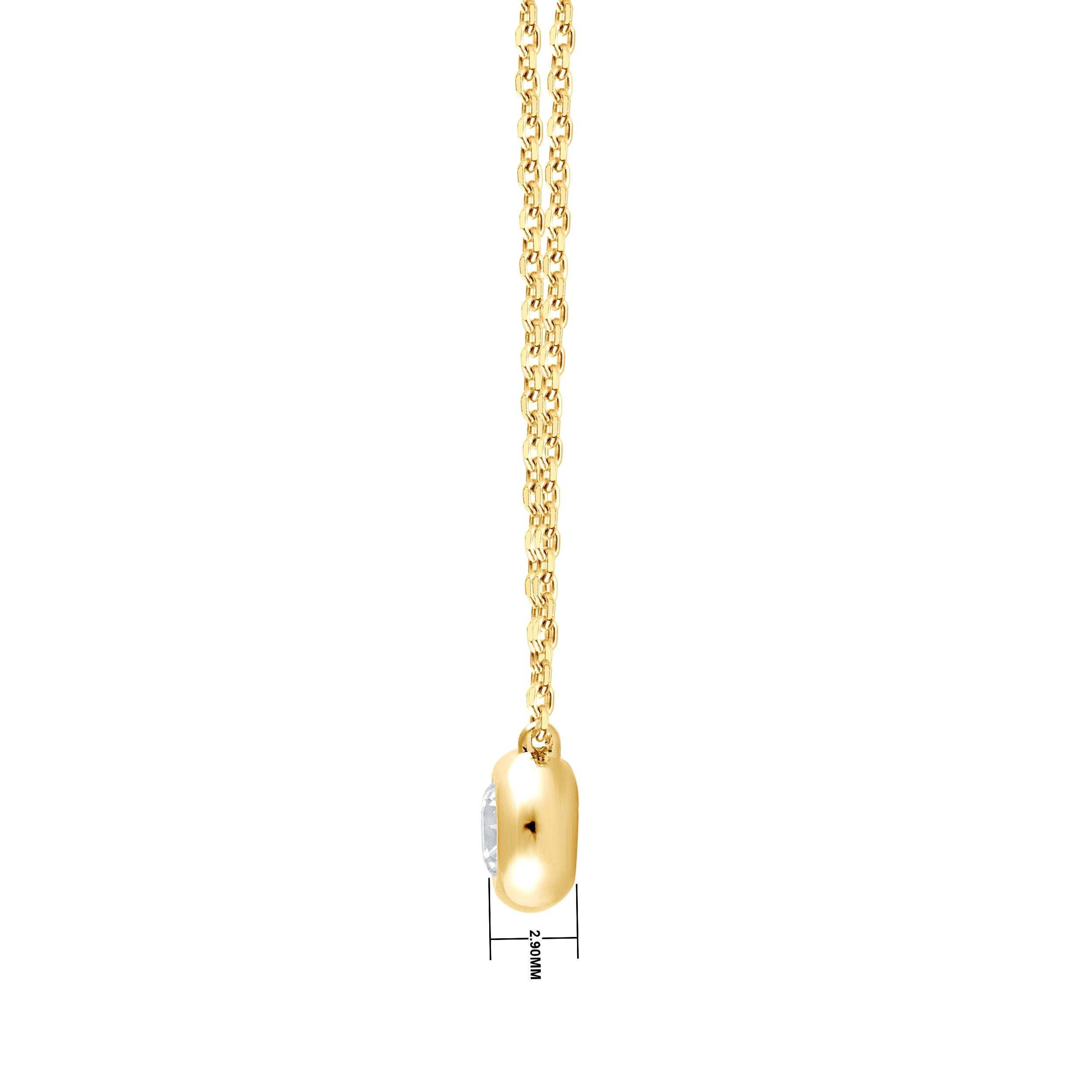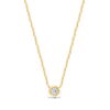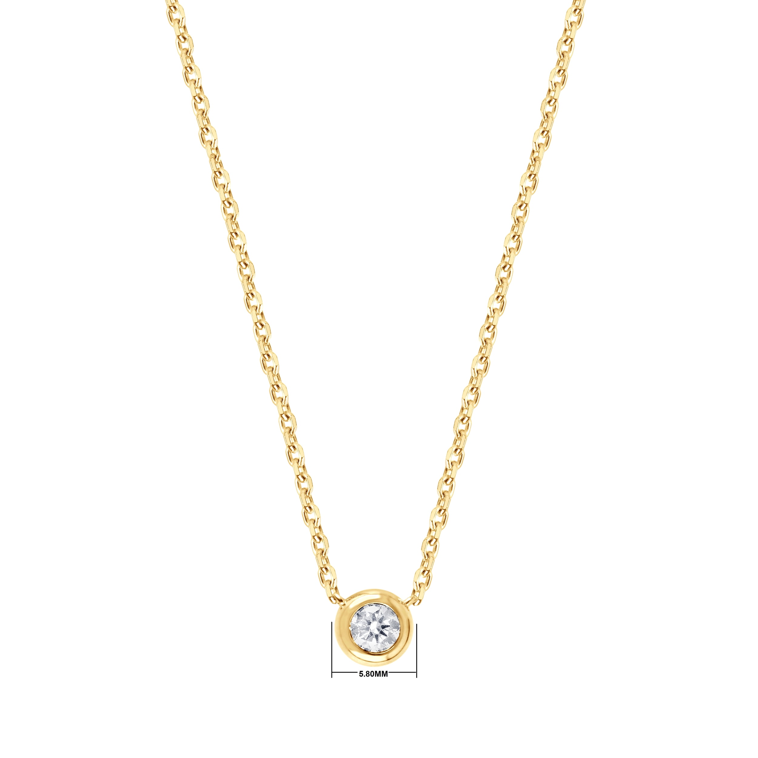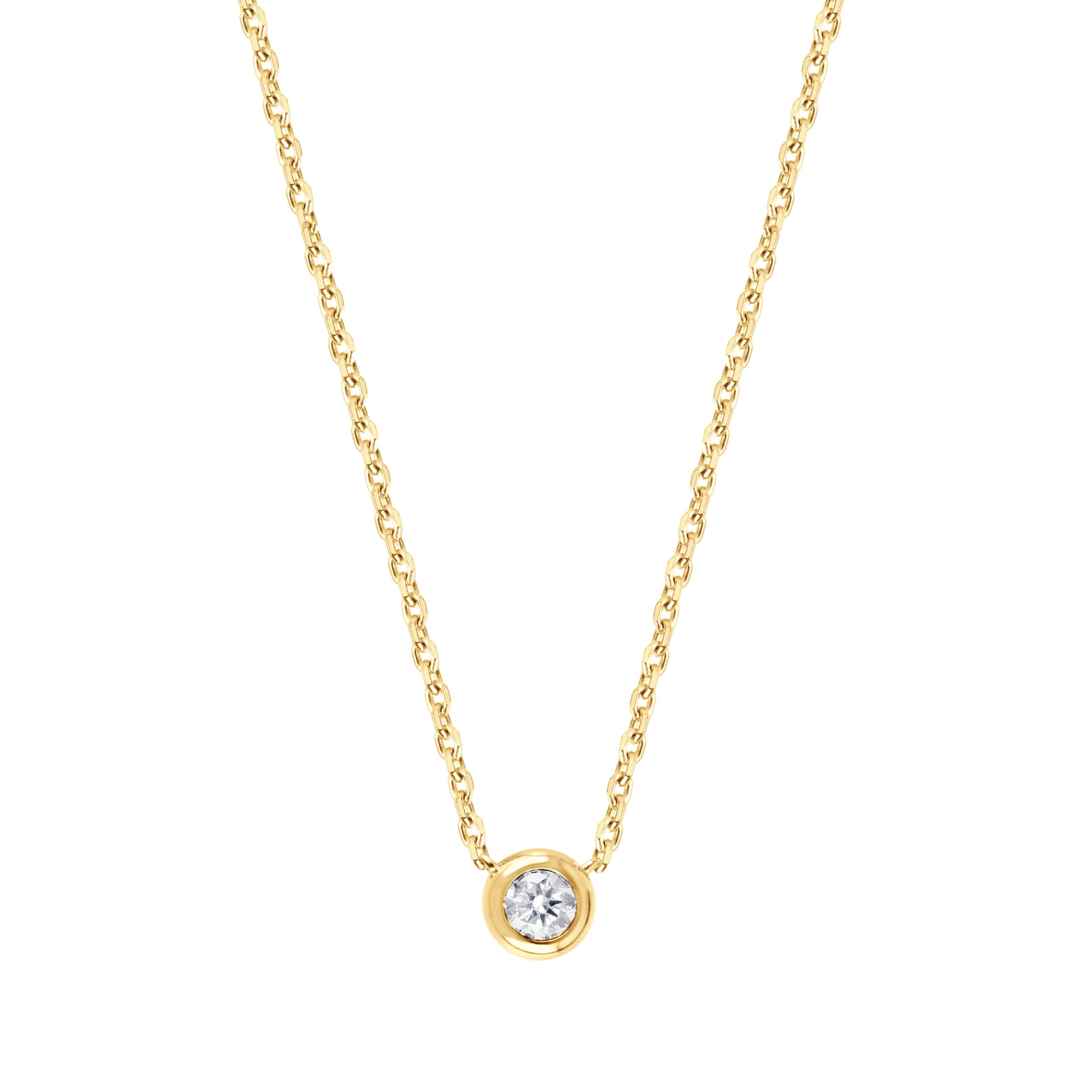 Unique Moments 1/5 ct Round Lab Grown Diamond Necklace in Sterling Silver (J, SI-I1). Always just the right look, this classic diamond necklace is the start of something beautiful. Crafted in yellow plating over sterling silver, this sparkling style showcases a 1/5 ct. lab-grown diamond solitaire boasting a color rank of J and clarity of SI-I1 – in a bezel setting. Buffed to a brilliant luster, this dainty design sits centered along an 18.0-inch cable chain that secures with a spring lock clasp.