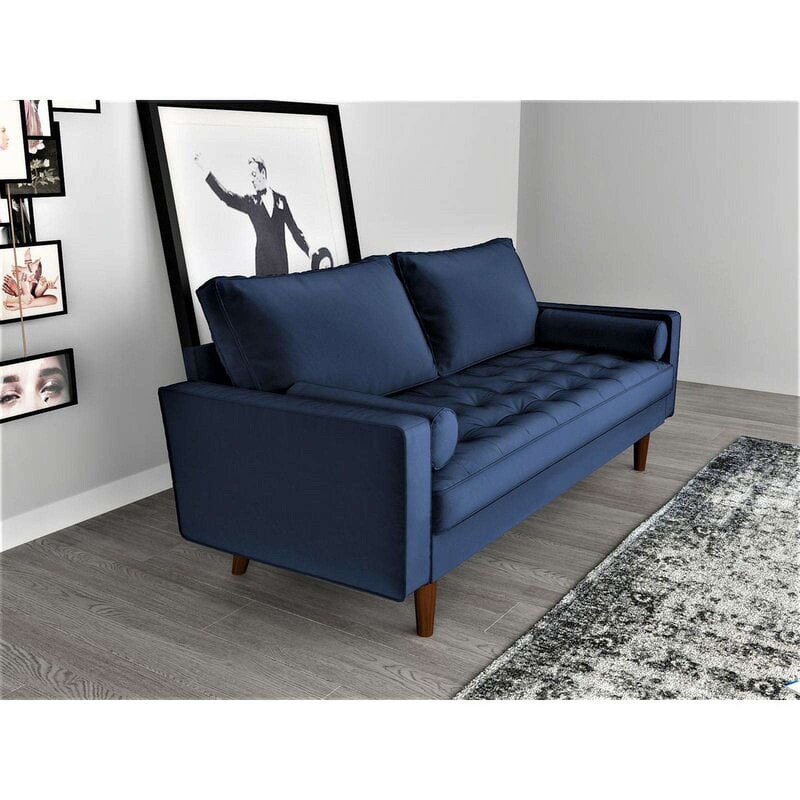 The classic design of the sofa, Mid-century modern style gives this wood frame Velvet Tufted sofa has a distinctive look that elevates your well-curated collection. It is button-tufted details that add a refined touch to any space while its streamlined silhouette and square arms fuse to make a modern look. It features the button-tufted seat and back cushion and finished wood legs. Designed by Meirxifeng furniture design. Two bolster pillows are included.