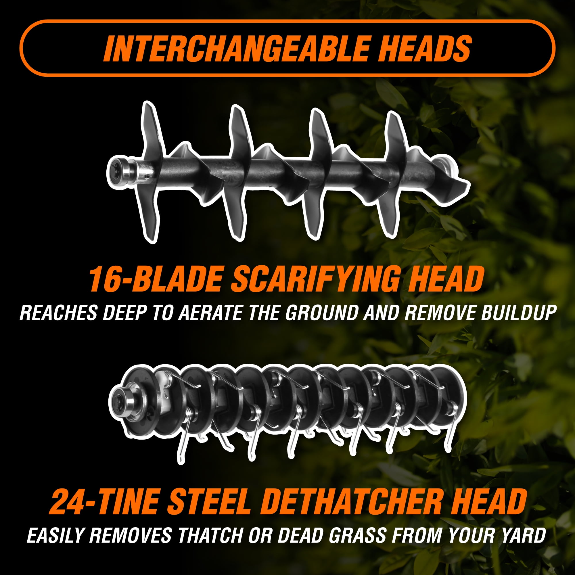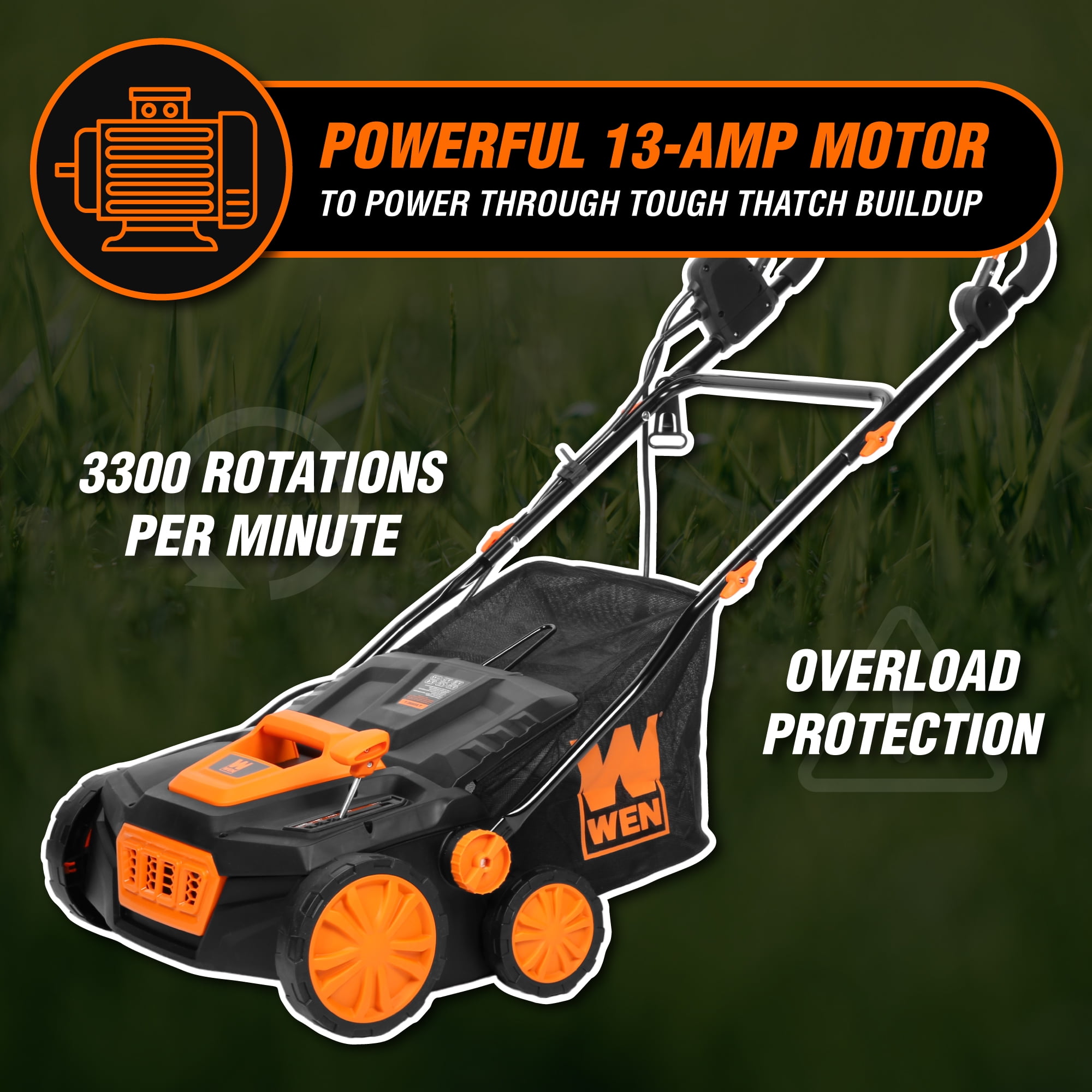 Remember when your lawn was the talk of the neighborhood? Treat your yard right with the WEN 2-in-1 Electric Dethatcher and Scarifier. This versatile machine both aerates your lawn while also removing thatch, debris, dead grass, and other unwanted organic matter. If left untended, this organic buildup prevents your lawn from getting the full amount of nutrients, air, and water that it needs to thrive. Our powerful 13-amp motor rotates up to 3300 times per minute, clearing a path up to 15 inches wide with each pass. The unwanted thatch is then collected into the included detachable collection bag. Choose between the 16-blade scarifying head and the 24 steel-tine dethatching head depending on the task at hand. The 5-position height adjustment features five depth settings: +1/4″, -1/8″, -1/4″, -3/8″, -1/2″. Overload protection automatically stops the motor during contact with hard rocks, concrete, and other immovable objects, preventing damage to the scarifier and the blades. And because it’s a WEN product, your 2-in-1 Electric Dethatcher comes backed by a two-year warranty, a helpful customer service line, and a stocked inventory of replacement parts, all to make sure you remember WEN.